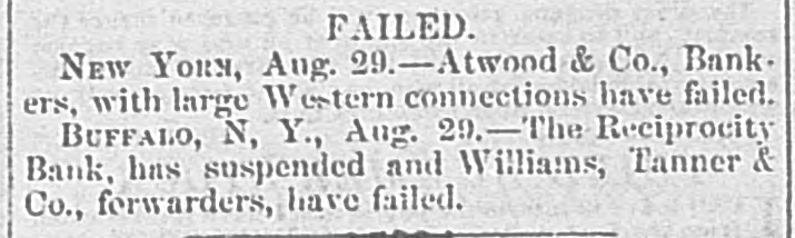 FAILED. NEW Your, Aug. 29.-Atwood & Co., Bank. ers, with large Western connections have failed. BUFFALO, N, Y., Aug. 29.-The Reciprocity Bank, has suspended and Williams, Tanner & Co., forwarders, have failed.