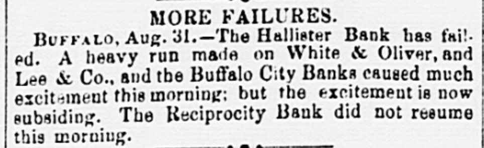 MORE FAILURES. BUFFALO, Aug. 31.-The Hallister Bank has failed. A heavy run made on White & Oliver, and Lee & Co., and the Buffalo City Banks caused much excitement this morning: but the excitement is now subsiding. The Reciprocity Bank did not resume this morning.