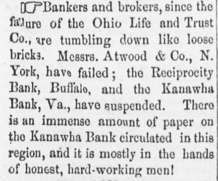 Bankers and brokers, since the failure of the Ohio Life and Trust Co., are tumbling down like loose bricks. Messrs. Atwood & Co., N. York, have failed; the Reciprocity Bank, Buffalo, and the Kanawha Bank, Va., have suspended. There is an immense amount of paper on the Kanawha Bank circulated in this region, and it is mostly in the hands of honest, hard-working men!