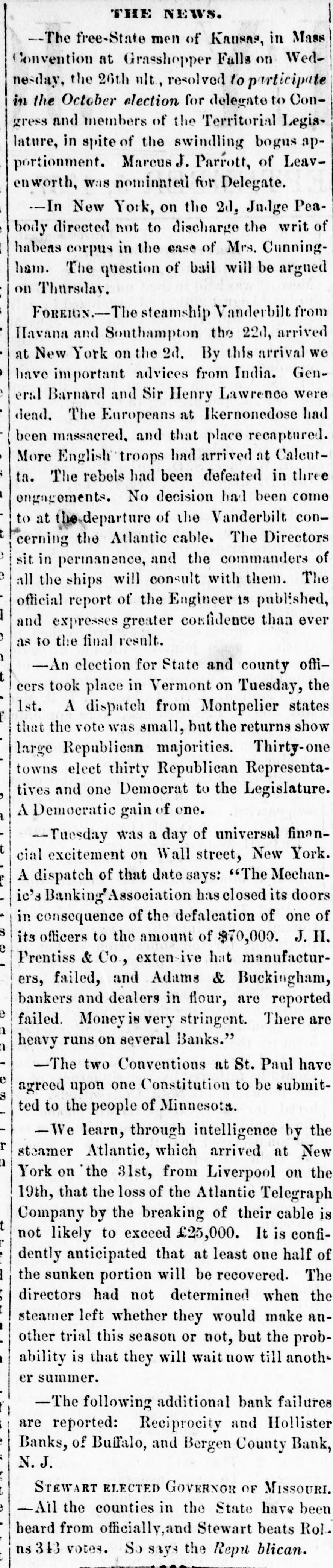 THE NEWS. -The free-State men of Kansas, in Mass Convention at Grasshopper Falls on Wednesday, the 26th nlt, resolved to participate in the October election for delegate to Congress and members of the Territorial Legislature, in spite of the swindling bogus apportionment. Marcus J. Parrott, of Leavenworth, was nominated for Delegate. -In New York, on the 2d, Judge Peabody directed not to discharge the writ of habeas corpus in the ease of Mrs. Cunningham. The question of bail will be argued on Thursday. FOREIGN-The steamship Vanderbilt from Havana and Southampton the 22d, arrived at New York on the 2d. By this arrival we have important advices from India. General Barnard and Sir Henry Lawrence were dead. The Europeans at Ikernonedose had been massacred, and that place recaptured. More English troops had arrived at Calcutta. The rebels had been defeated in three engagements. No decision had been come to at the departure of the Vanderbilt concerning the Atlantic cable. The Directors sit in permanance, and the commanders of all the ships will consult with them. The official report of the Engineer is published, and expresses greater confidence than ever as to the final result. -An election for State and county officers took place in Vermont on Tuesday, the 1st. A dispatch from Montpelier states that the vote was small, but the returns show large Republican majorities. Thirty-one towns elect thirty Republican Representatives and one Democrat to the Legislature. A Democratic gain of one. -Tuesday was a day of universal financial excitement on Wall street, New York. A dispatch of that date says: "The Mechanic's Banking' Association has closed its doors in consequence of the defalcation of one of its officers to the amount of $70,000. J. H. Prentiss & Co, exten-ive hat manufacturers, failed, and Adams & Buckingham, bankers and dealers in flour, are reported failed. Money is very stringent. There are heavy runs on several Banks." -The two Conventions at St. Paul have agreed upon one Constitution to be submitted to the people of Minnesota. -We learn, through intelligence by the steamer Atlantic, which arrived at New York on the 31st, from Liverpool on the 19th, that the loss of the Atlantic Telegraph Company by the breaking of their cable is not likely to exceed £25,000. It is confidently anticipated that at least one half of the sunken portion will be recovered. The directors had not determined when the steamer left whether they would make another trial this season or not, but the probability is that they will wait now till another summer. -The following additional bank failures are reported: Reciprocity and Hollister Banks, of Buffalo, and Bergen County Bank, N.J. STEWART ELECTED GOVERNOR OF MISSOURI. -Ail the counties in the State have been heard from officially, and Stewart beats Rol.. ns 343 votes. Sasava the Renut blican
