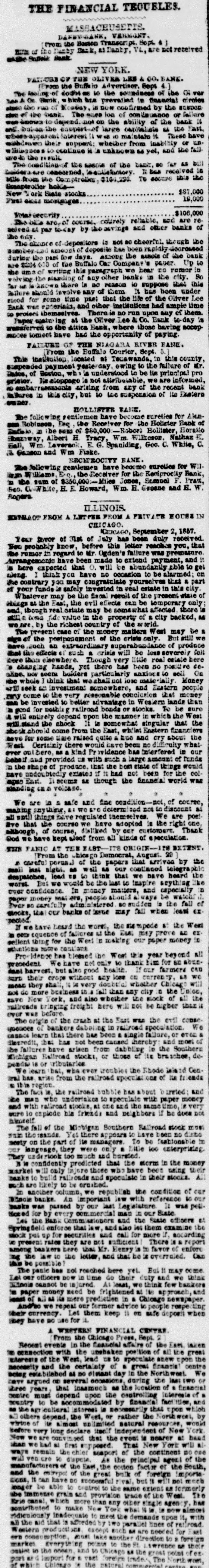 THE FINANCIAL TROUBLES. MASSACHUSETTS. DANBY-BANK, VERNONT. [From the Boston Transcript, Sept. 4.] Bills of the Danby Bank, at Danby, Vt., are not received at the Suffolk Bank. NEW YORK. FAILURE OF THE OLIVER LEE & CO. BANK. [From the Buffalo Advertiser, Sept. 4.] The feeling of doubt as to the soundness of the Oliver Lee & Co. Bank, which has prevailed in financial circles since the run of Monday, is now confirmed by the suspen- sion of the bank. The question of continuance or failure was known to depend, not on the ability of the bank it- self, but on the support of large capitalists at the East, whose apparent interest it was to maintain it. These have withdrawn their support; whether from inability or un- willingness to continue it is unknown as yet, and the fail- ure is the result. The condition of the assets of the bank, so far as bill holders are concerned, is satisfactory. It has received in aids from the Comptroller, $104,220. To secure this the Comptroller holds: New York State stocks...$87,000 First class mortgages19,000 Total security.$106,000 The bills are, of course, entirely reliable, and are re- ceived at par to-day by the savings and other banks of the city. The chance of depositors is not so cheerful, though the number and amount of deposits has been rapidly decreased during the past few days. Among the assets of the bank are $204,600 of the Buffalo Car Company's paper. Up to the time of writing this paragraph we hear no rumor in- volving the standing of any other banks in the city. So far as is known there is no reason to suppose that this failure should involve any of them. It has been under- stood for some time past that the life of the Oliver Lee Bank was precarious, and other institutions had ample time to protect themselves. There is no run upon any of them. Paper waiting at the Oliver Lee & Co. Bank to-day is transferred to the Attica Bank, where those having accep- tances to meet have had the opportunity of paying. FAILURE OF THE NIAGARA RIVER BANK. [From the Buffalo Courier, Sept. 5.] This institution, located at Tonawanda, in this county, suspended payment yesterday, owing to the failure of Mr. Bates, of Boston, who is understood to be its principal pro- prietor. Its stoppage is not attributable, we are informed, to embarrassments arising from any of the recent bank failures in this city, but to the suspension of its Eastern debtor. HOLLISTER BANK. The following gentlemen have become sureties for Alanson Robinson, Esq., the Receiver for the Hollister Bank of Buffalo, in the sum of $80,000—Robert Hollister, Horatio S. Stowway, Albert H. Tracy, Wm. Wilkeson, Nathan F. Hall, Wm. Laverack, E. G. Spaulding, Geo. C. White, C. B. Ganson and Wm. Fiske. RECIPROCITY BANK. The following gentlemen have become sureties for William Williams, Esq., the Receiver for the Reciprocity Bank, in the sum of $350,000:—Miles Jones, Samuel F. Pratt, Geo. C. White, H. E. Howard, Wm. H. Groene and E. W. Rogers. ILLINOIS. EXTRACT FROM A LETTER FROM A PRIVATE HOUSE IN CHICAGO. CHICAGO, September 2, 1857. Your favor of 31st of July has been duly received. You probably know, before this letter reaches you, that the rumor in regard to Mr. Ogden's failure was premature. Arrangements have been made to extend payment, and it is here expected that O. will be abundantly able to get along. I think you have no occasion to be alarmed; on the contrary you may congratulate yourselves that a part of your funds is safely invested in real estate in this city. Whatever may be the fiscal result of the present state of things at the East, the evil effects can be temporary only; and, though real estate may be somewhat affected, there is still a bona fide value in the property of a city backed, as we are, by the richest country of the world. The present case of the money matters West may be a sign of the postponement of the crisis only. But still we have such an extraordinary superabundance of produce that the effects of such a crisis will be less severely felt here than elsewhere. Though very little real estate here is changing hands, yet there has been no positive de- cline, nor seems holders particularly anxious to sell. On the whole I think that we shall not lose materially. Money will seek an investment somewhere, and Eastern people may come to the very reasonable conclusion that money can be invested to better advantage in Western lands than in good for nothing railroad bonds or stocks. To be sure it will entirely depend upon the manner in which the West will stand the shock. It is somewhat singular that the shock should come from the East, whilst Eastern financiers have for some time raised quite a hue and cry about the West. Certainly there would have been no difficulty what- ever out here, as a kind Providence has interfered in our behalf and provided us with such a large amount of funds in the shape of produce, that the best state of things would have undoubtedly existed if it had not been for the col- lapse East. It seems as though the financial world was standing on a volcano. We are in a safe and fine condition—not, of course, making anything, as we are determined not to discount at all until things have regulated themselves. We are posi- tive that the course we have adopted is the right one, although, of course, disliked by our customers. Thank God we have kept aloof from all kinds of speculation. THE PANIC AT THE EAST—ITS ORIGIN—ITS EXTENT. [From the Chicago Democrat, August 29.] A careful perusal of the papers that arrived by the mail last night, as well as our continued telegraphic despatches, lead us to think that we have heard the worst. But we would be the last to inspire anything like over confidence. In money matters, and especially in paper money matters, people should always be watch- ful. Ever so carefully administered, so sudden is the fall of stocks, that our banks of issue may fall when least ex- pected. If we have heard the worst, the stampede at the West in consequence 