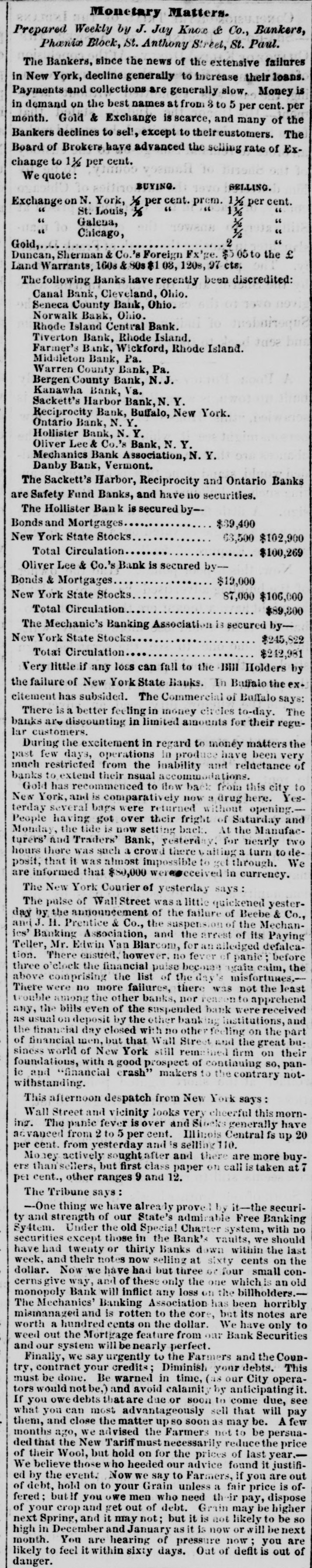 Monetary Matters. Prepared Weekly by J. Jay Know & Co., Bankers, Phanix Block, St. Anthony Street, St. Paul. The Bankers, since the news of the extensive failures in New York, decline generally to increase their loans. Payments and collections are generally slow. Money is in demand on the best names at from 3 to 5 per cent. per month. Gold & Exchange is scarce, and many of the Bankers declines to sell, except to their customers. The Board of Brokers have advanced the selling rate of Exchange to 1½ per cent. We quote: BUYING. SELLING. Exchange on N. York, ½ per cent. prem. 1½ per cent. " " " " 1½ St. Louis, X " " Galena, " " ½ Chicago, " 2 Gold, Duncan, Sherman & Co.'s Foreign Fx'ge. $5 05 to the £ Land Warrants, 160s & 80s 03, 120s, 97 ets. The following Banks have recently been discredited: Canal Bank, Cleveland, Ohio. Seneca County Bank, Ohio. Norwalk Bank, Ohio. Rhode Island Central Bank. Tiverton Bank, Rhode Island. Farmer's Bank, Wickford, Rhode Island. Middleton Bank, Pa. Warren County Bank, Pa. Bergen County Bank, N.J. Kanawha Bank, Va. Sackett's Harbor Bank, N. Y. Reciprocity Bank, Buffalo, New York. Ontario Bank, N. Y. Hollister Bank, N. Y. Oliver Lee & Co.'s Bank, N. Y. Mechanics Bank Association, N. Y. Danby Bank, Vermont. The Sackett's Harbor, Reciprocity and Ontario Banks are Safety Fund Banks, and have no securities. The Hollister Ban k is secured by-Bonds and Mortgages $39,400 New York State Stocks 63,500 $102,900 Total Circulation $100,269 Oliver Lee & Co.'s Bank is secured byBonds & Mortgages $19,000 New York State Stocks 87,000 $106,000 Total Circulation $89,800 The Mechanic's Banking Association is secured byNew York State Stocks. $245,822 Total Circulation $242,981 Very little if any loss can fall to the Bill Holders by the failure of New York State Banks. In Baffalo the excitement has subsided. The Commercial of Buffalo says: There is a better feeling in money circles to-day. The banks are discounting in limited amounts for their regular customers. During the excitement in regard to money matters the past few days, operations in produce have been very much restricted from the inability and reluctance of banks to extend their nsual accommodations. Gold has recommenced to flow back from this city to New York, and is comparatively now a drug here. Yesterday several bags were returned without opening.— People having got over their fright of Saturday and Monday, the tide is now setting back. At the Manufacturers' and Traders' Bank, yesterday, for nearly two hours there was such a crowd there waiting a turn to deposit, that it was almost impossible to get through. We are informed that $80,000 were eceived in currency. The New York Courier of yesterday says: The pulse of WallStreet was a little quickened yesterday by the announcement of the failure of Beebe & Co., and J. H. Prentice & Co., the suspension of the Mechanics' Banking Association, and the arrest of its Paying Teller, Mr. Edwin Van Blarcom, for an alledged defalcation. There ensued, however, no fever of panic; before three o'clock the financial pulse become again calm, the above comprising the list of the day's misfortunes,-There were no more failures, there was not the least trouble among the other banks, nor reason to apprehend any, the bills even of the suspended bank were received as usual on deposit by the other banking institutions, and the financial day closed with no other feeling on the part of financial men, but that Wall Street and the great business world of New York still remained firm on their foundations, with a good prospect of continuing so, panic and "financial crash" makers to the contrary notwithstanding. This afternoon despatch from New York says: Wall Street and vicinity looks very cheerful this morning. The panic fever is over and Stocks generally have idvanced from 2 to 5 per cent. Illinois Central fs up 20 per cent. from yesterday and is selling 110. Money actively soughtafter and there are more buyers than'sellers, but first class paper on call is taken at 7 per cent., other ranges 9 and 12. The Tribune says: --One thing we have alrea prove by it-the security and strength of our State's admirable Free Banking Sy4tem. Under the old Special Charter system, with no securities except those in the Bank's vaults, we should have had twenty or thirty Banks down within the last week, and their notes now selling at sixty cents on the dollar. Now we have had but three or four small congive way, and of these only the one which is an old monopoly Bank will inflict any loss on the billholders.The Mechanics' Banking Association has been horribly mismanaged and is rotten to the core, but its notes are worth a hundred cents on the dollar. We have only to weed out the Mortgage feature from our Bank Securities and our system will be nearly perfect. Finally, we say urgently to the Farmers and the Country, contract your credits; Diminish your debts. This must be done. Be warned in time, (as our City operators would not be,) and avoid calamity by anticipating it. If you owe debts thatare due or soon to come due, see what you can most advantageously sell that will pay them, and close the matter up SO soon as may be. A few months ago, we advised the Farmers not to be persuaded that the New Tariffmust necessarily reducethe price