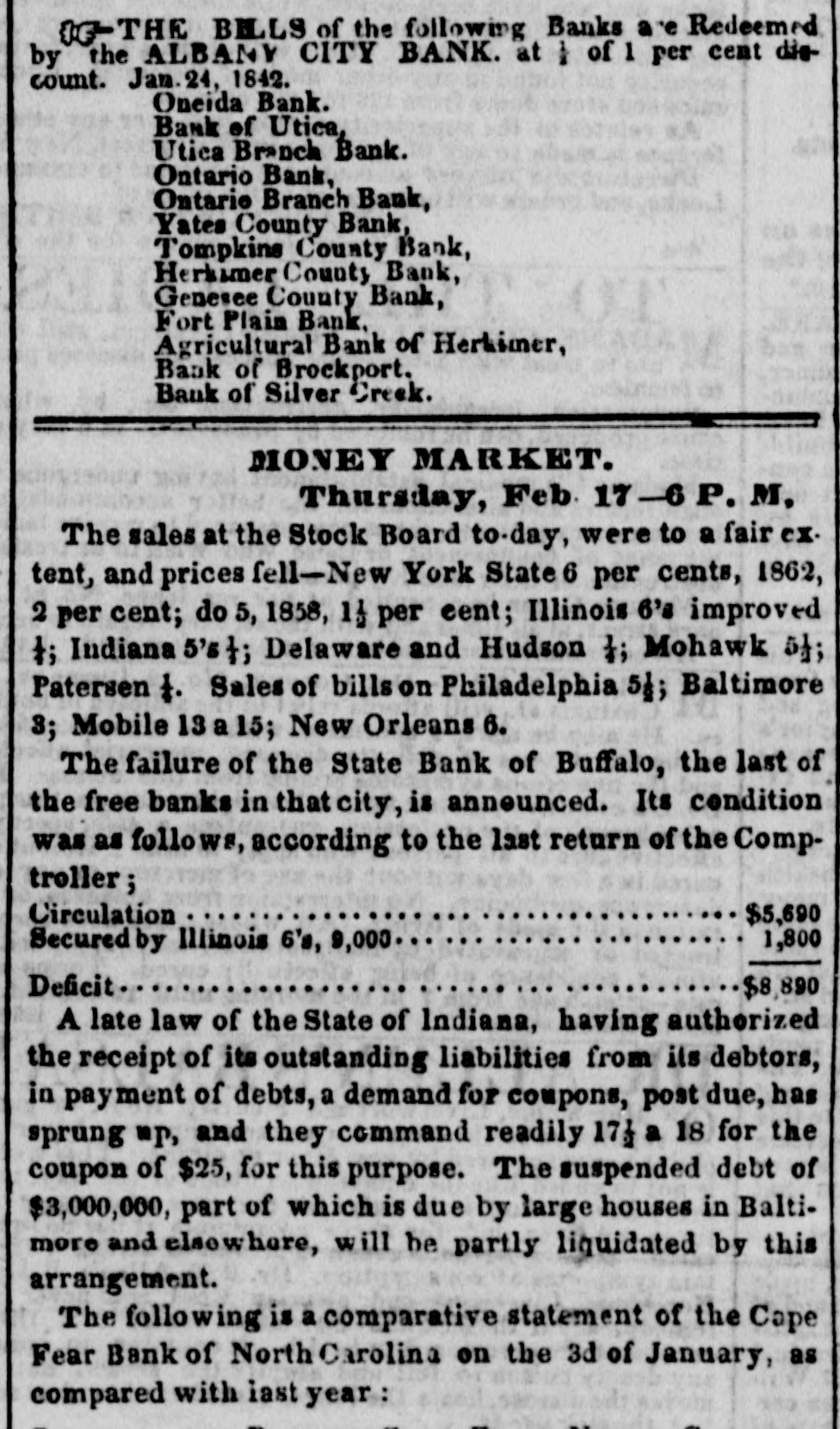 OG-THE BILLS of the following Banks are Redeemed by the ALBANY CITY BANK. at 1 of 1 per cent diecount. Jan.24, 1842. Oneida Bank. Bank of Utica, Utica Branch Bank. Ontario Bank, Ontario Branch Bank, Yates County Bank, Tompkins County Bank, Herkimer County Bank, Genesee County Bank, Fort Plain Bank. Agricultural Bank of Herkimer, Bank of Brockport. Bank of Silver Creek. MONEY MARKET. Thursday, Feb. 17-6 P. M. The sales at the Stock Board to-day, were to a fair ex. tent, and prices fell-New York State 6 per cents, 1862, 2 per cent; do 5, 1858, 11 per cent; Illinois 6's improved t; Indiana 5's ;; Delaware and Hudson 1; Mohawk 5}; Patersen 1. Sales of bills on Philadelphia 5₫; Baltimore 3; Mobile 13 a 15; New Orleans 6. The failure of the State Bank of Buffalo, the last of the free banks in that city, is announced. Its condition was as follows, according to the last return of the Comptroller; Circulation $5,690 1,800 Secured by Illinois 6's, 9,000 Deficit $8,890 A late law of the State of Indiana, having authorized the receipt of its outstanding liabilities from its debtors, in payment of debts, a demand for coupons, post due, has sprung up, and they command readily 17 & a 18 for the coupon of $25, for this purpose. The suspended debt of $3,000,000, part of which is due by large houses in Baltimore and elsewhere, will be partly liquidated by this arrangement. The following is a comparative statement of the Cape Fear Bank of North Carolina on the 3d of January, as compared with last year :