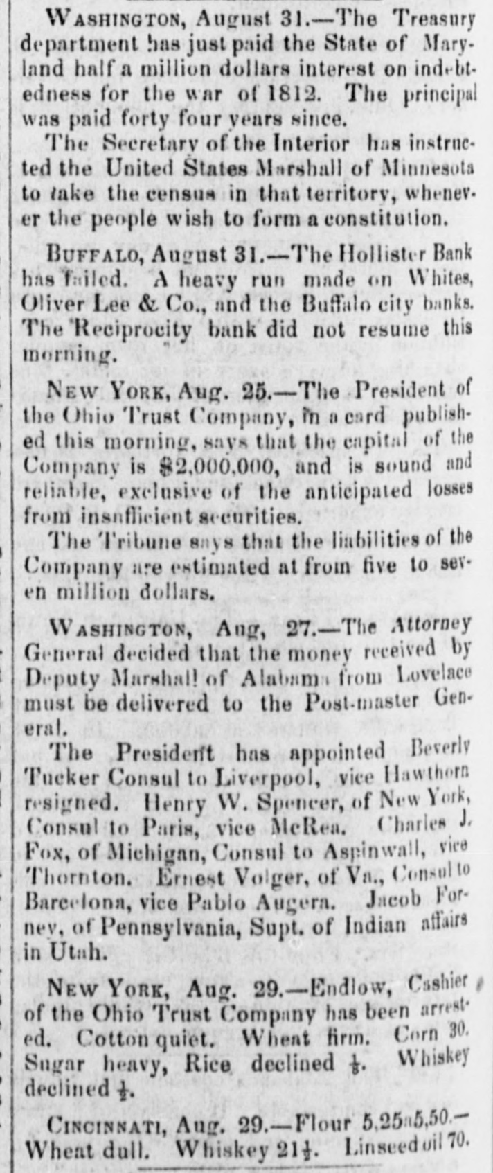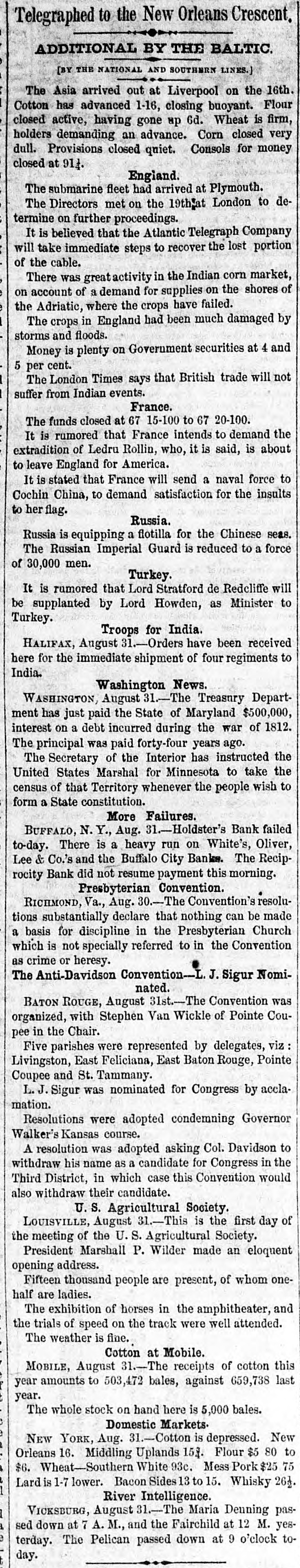 BY TELEGRAPH. BY THE NATIONAL LINE. [Reports Furnished by the Associated Press.] NEW York, August 29.-The ship Clara Brookman went ashore at Squam Beach last night. Sue is a total loss. Her passengers and crew were saved, NEW ORLEANS, August 31.-The "Empire City" arrived last night with Havana dates of the 27th. The Illinois went ashore on Colorado reef. She got off with little damage, though with much difficulty, with the assistance of a Spanish steamer, which the authorities sent to her. She will probably leave Havana OD the 29th, with over a million and half specie California Dews unimportant. There had been several large fires in the interior. New York, Aug. 31.-The steamer Atlantic arrived with Liverpool dates of the 19th. The Asia arrived at Liverpool on the 16th. Her news caused an advance of 1.16 in Liverpool. The market buoyant. The weather is favorable for crops.Flour active at an advance of 6 pence; wheat firm; holders dema nd an advance; corn very dull; provisions quiet; consols 911; cotton, sales for 3 days 28,000 bales, of which speculators and exporters took 4000 each. News unimportant. The submarioe fleet arrived at Plymouth. The Directors meet at London on the 19th to determine further proceedings. It is believed the Company will take immediate steps to rescue the lost portion of the cable. Storms and floods have caused much damage in the crops in England. Money on Government securities plenty, at from 4 to 5 per cent. The Times says that British trade will not suffer from Indian events. There is great activity in Indian corn for the shores of the Adriatic, where the crop has failed. It is rumored that France intends to demand the extradition of Ledru Rollin who is about to leave for America. It is stated that France will send a naval expedition to Cochin, China, to demand Satisfaction for insults to her flag. Russia is equipping a flotilia for the China Seas. The Russian Imperial Guards have been reduced to 3,000. It is rumored that Lord Stratford De Redcliffe will be supplanted by Lord Howden. LOUISVILLE, August 31.-The National Agricul cultural Fair opened by an address from Marshall P. Wilder. There were 20 to 30,000 persons on the ground. The weather is remarkably fine. LOUISVILLE, August 31.-The United States Agricultural Society-First day-15,000 persons present, half of whom were ladies. Mr. Wilder the President, made an eloquent opening address. Friday was devoted to the trial of speed on the track, and the exhibition of horses. The weather is fine. Halifax, Aug. 31.-Orders have been received here to ship four regiments immediately to India. WASHIGTON, August 31,-The Treasury department has just paid the State of Maryland half a mil lion dollars interest on indebtedness for the war of 1812. The principal was paid forty-four years since. 1 The Secretary of the Interior has instructed the United States Marshall of Minnesota to take the census in that territory, whenever the people wish to form a constitution. BUFFALO, August 31.-The Hollister Bank has failed. A heavy run was made on Whites, Oliver Lee & Co., and the Buffalo city banks. The Reciprocity bank did not resume this morning.