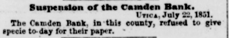 Suspension of the Camden Bank. UTICA, July 22, 1851. The Camden Bank, in this county, refused to give specie to. day for their paper.