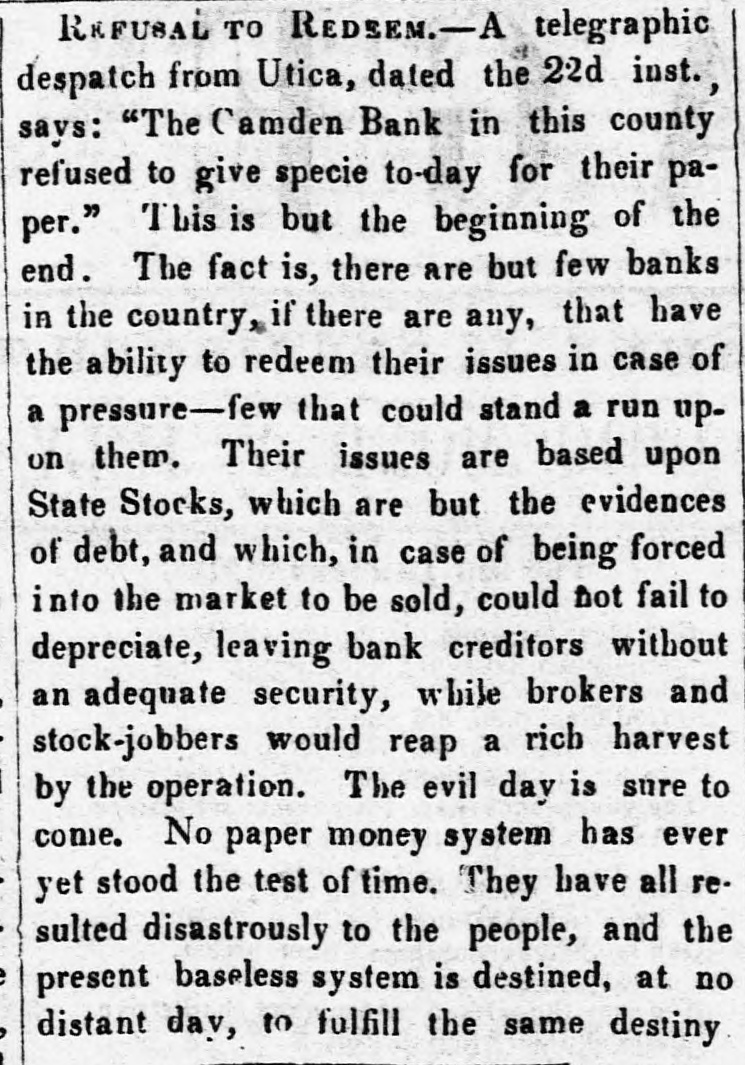 REFUBAL TO REDEEM.-A telegraphic despatch from Utica, dated the 22d inst. savs: "The Camden Bank in this county refused to give specie to-day for their paper." This is but the beginning of the end. The fact is, there are but few banks in the country, if there are any, that have the ability to redeem their issues in case of a pressure-few that could stand a run upon them. Their issues are based upon State Stocks, which are but the evidences of debt, and which, in case of being forced into the market to be sold, could not fail to depreciate, leaving bank creditors without an adequate security, while brokers and stock-jobbers would reap a rich harvest by the operation. The evil day is sure to come. No paper money system has ever yet stood the test of time. They have all resulted disastrously to the people, and the present baseless system is destined, at no distant day, to fulfill the same destiny