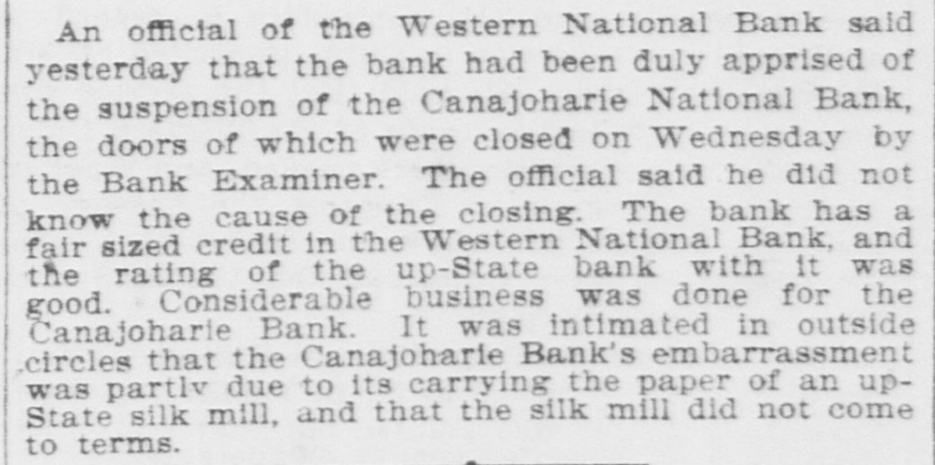 An official of the Western National Bank said yesterday that the bank had been duly apprised of the suspension of the Canajoharie National Bank, the doors of which were closed on Wednesday by the Bank Examiner. The official said he did not know the cause of the closing. The bank has a fair sized credit in the Western National Bank, and the rating of the up-State bank with it was good. Considerable business was done for the Canajoharie Bank. It was intimated in outside circles that the Canajoharie Bank's embarrassment was partlv due to its carrying the paper of an upState silk mill, and that the silk mill did not come to terms.