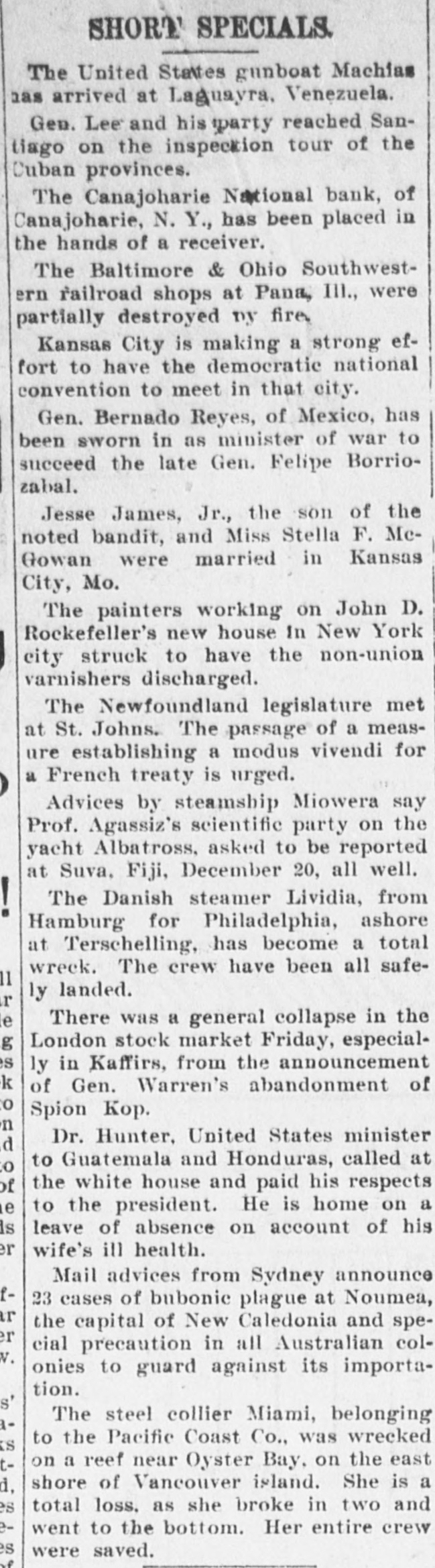 SHORT SPECIALS. The United Stattes gunboat Machias has arrived at Laguayra, Venezuela. Gen. Lee and his iparty reached Santiago on the inspection tour of the Cuban provinces. The Canajoharie National bank, of Canajoharie, N. Y., has been placed in the hands of a receiver. The Baltimore & Ohio Southwestern railroad shops at Pana, III., were partially destroyed ny fire. Kansas City is making a strong effort to have the democratic national convention to meet in that city. Gen. Bernado Reyes, of Mexico, has been sworn in as minister of war to succeed the late Gen. Felipe Borriozabal. Jesse James, Jr., the son of the noted bandit, and Miss Stella F. MeGowan were married in Kansas City, Mo. The painters working on John D. Rockefeller's new house In New York city struck to have the non-union varnishers discharged. The Newfoundland legislature met at St. Johns. The passage of a measure establishing a modus vivendi for a French treaty is urged. Advices by steamship Miowera say Prof. Agassiz's scientific party on the yacht Albatross, asked to be reported at Suva. Fiji, December 20, all well. The Danish steamer Lividia, from Hamburg for Philadelphia, ashore at Terschelling, has become a total wreck. The crew have been all safe11 ly landed. r e There was a general collapse in the g London stock market Friday, especialS ly in Kaffirs, from the announcement k of Gen. Warren's abandonment of o Spion Kop. n Dr. Hunter, United States minister d to Guatemala and Honduras, called at o the white house and paid his respects of e to the president. He is home on a IS leave of absence on account of his er wife's ill health. Mail advices from Sydney announce f23 cases of bubonic plague at Noumea, ar the capital of New Caledonia and speer cial precaution in all Australian colV. onies to guard against its importation. The steel collier Miami, belonging to the Pacific Coast Co., was wrecked IS on a reef near Oyster Bay, on the east - shore of Vancouver island. She is a d, total loss. as she broke in two and es went to the bottom. Her entire crew es were saved.