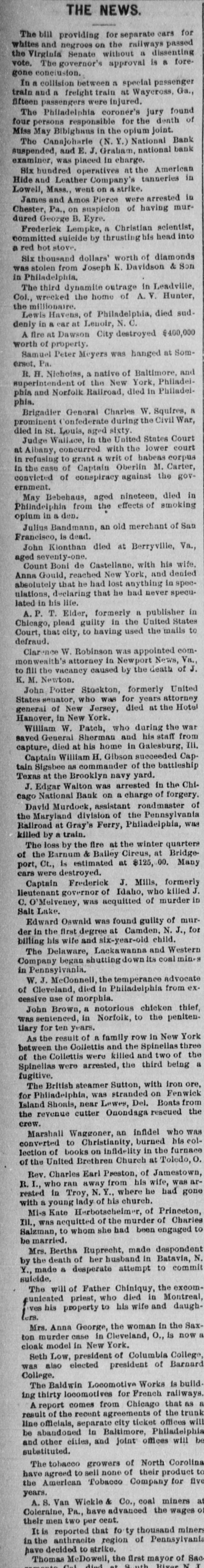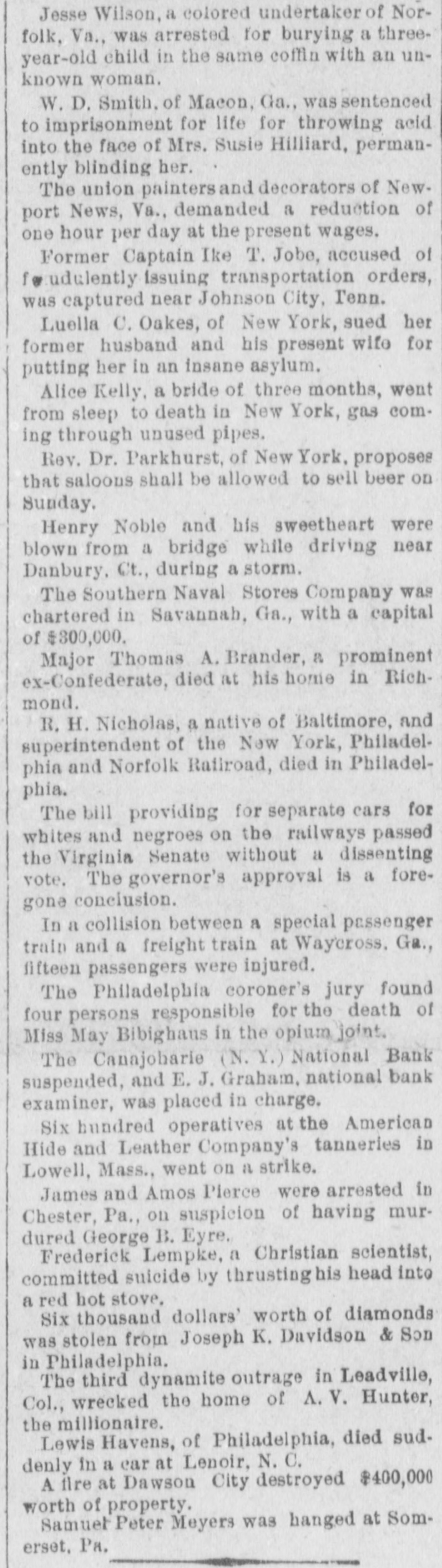 Jesse Wilson, a colored undertaker of Norfolk, Va., was arrested for burying a threeyear-old child in the same coffin with an unknown woman. W. D. Smith. of Macon, Ga., was sentenced to imprisonment for life for throwing acid into the face of Mrs. Suste Hilliard, permanently blinding her. The union painters and decorators of Newport News, Va., demanded a reduction of one hour per day at the present wages. Former Captain Ike T. Jobe, accused of f udulently issuing transportation orders, was captured near Johnson City, Tenn. Luella C. Oakes, of New York, sued her former husband and his present wife for putting her in an insane asylum. Alice Kelly, a bride of three months, went from sleep to death in New York, gas coming through unused pipes. Rev. Dr. Parkhurst, of New York, proposes that saloons shall be allowed to sell beer on Sunday. Henry Noble and his sweetheart were blown from a bridge while driving near Danbury. Ct., during a storm. The Southern Naval Stores Company was chartered in Savannah, Ga., with a capital of $300,000. Major Thomas A. Brander, a prominent ex-Confederate, died at his home in Richmond. R.H. Nicholas, a native of Baltimore, and superintendent of the New York, Philadelphia and Norfolk Railroad, died in Philadelphia. The bill providing for separate cars for whites and negroes on the railways passed the Virginia Senate without a dissenting vote. The governor's approval is a foregone conclusion. In a collision between a special passenger train and a freight train at Waycross. Ga., fifteen passengers were injured. The Philadelphia coroner's jury found four persons responsible for the death of Miss May Bibighaus in the opium joint. The Cannjobarie (N.Y.) National Bank suspended, and E. J. Graham, national bank examiner, was placed in charge. Six hundred operatives at the American Hide and Leather Company's tanneries in Lowell, Mass., went on a strike. James and Amos Pierce were arrested in Chester, Pa., on suspicion of having murdured George B. Eyre. Frederick Lempke, a Christian scientist, committed suicide by thrusting his head into a red hot stove. Six thousand dollars' worth of diamonds was stolen from Joseph K. Davidson & Son in Philadelphia. The third dynamite outrage in Leadville, Col., wrecked the home of A. V. Hunter, the millionaire. Lewis Havens, of Philadelphia, died suddenly in a ear at Lenoir, N. C. A fire at Dawson City destroyed $400,000 worth of property. Samuel Peter Meyers was hanged at Somerset. Pa.