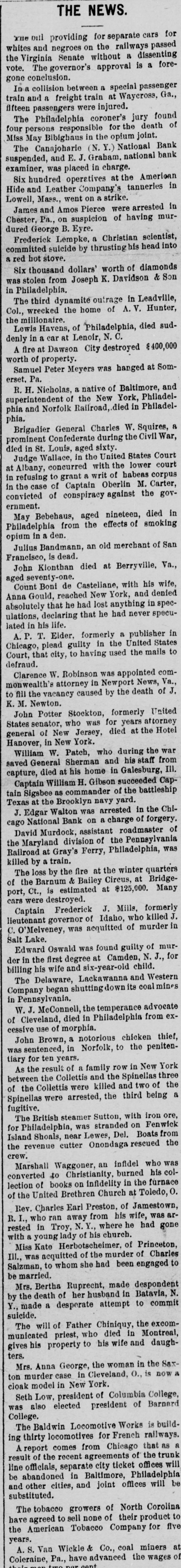 THE NEWS. The bill providing for separate cars for whites and negroes on the railways passed the Virginia Senate without a dissenting vote. The governor's approval is a foregone conclusion. In a collision between a special passenger train and a freight train at Wayeross, Ga., fifteen passengers were injured. The Philadelphia coroner's jury found four persons responsible for the denth of Miss May Bibighaus in the opium joint. The Canajoharie (N. Y.) National Bank suspended, and E. J. Grabam. national bank examiner, was placed in charge. Six hundred operatives at the American Hide and Leather Company's tanneries in Lowell, Mass., went on strike. James and Amos Pierce were arrested in Chester, Pa., on suspicion of having murdured George B. Eyre. Frederick Lempke, a Christian scientist, committed suicide by thrusting his head into a red hot stove. Six thousand dollars' worth of diamonds was stolen from Joseph K. Davidson & Son in Philadelphia, The third dynamite outrage in Leadville, Col., wrecked the home of A. V. Hunter, the millionaire. Lewis Havens, of Philadelphia, died suddenly in a car at Lenoir, N. C. A fire at Dawson City destroyed $400,000 worth of property. Samuel Peter Meyers was hanged at Somerset. Pa. R. H. Nicholas, a native of Baltimore, and superintendent of the New York, Philadelphia and Norfolk Railroad, died in Philadelphia. Brigadier General Charles W. Squires, a prominent Confederate during the Civil War, died in St. Louis, aged sixty. Judge Wallace, in the United States Court at Albany, concurred with the lower court in refusing to grant a writ of habeas corpus in the case of Captain Oberlin M. Carter, convicted of conspiracy against the government. May Bebehaus, aged nineteen, died in Philadelphia from the effects of smoking . opium in den. Julius Bandmann, an old merchant of San Francisco, is dead. John Kionthan died at Berryville, Va., aged seventy-one. Count Boni de Castellane, with his wife. Anna Gould, reached New York, and denied absolutely that he had lost anything in speculations, declaring that he had never speculated in his life. A.P. T. Elder, formerly a publisher in Chicago, plead guilty in the United States Court, that city, to having used the mails to defraud. Clarence W. Robinson was appointed commonwealth's attorney in Newport News, Va., to fill the vacancy caused by the death of J. K. M. Newton. John Potter Stockton, formerly United States senator, who Was for years attorney general of New Jersey, died at the Hotel Hanover, in New York. William W. Patch, who during the war saved General Sherman and his staff from capture, died at his home in Galesburg, III. Captain William H. Gibson succeeded Cap. tain Sigsbee as commander of the battleship Texas at the Brooklyn navy yard. J. Edgar Walton was arrested in the Chicago National Bank on a charge of forgery. David Murdock, assistant roadmaster of the Maryland division of the Pennsylvania Railroad at Gray's Ferry, Philadelphia, was killed by train. The loss by the fire at the winter quarters of the Barnum & Bailey Circus, at Bridgeport, Ct., is estimated at $125, 00. Many cars were destroyed. Captain Frederick J. Mills, formerly lieutenant governor of Idaho, who killed J. C. O'Melveney, Was acquitted of murder in Salt Lake. Edward Oswald was found guilty of murder in the first degree at Camden. N. J., for billing his wife and six-year-old child. The Delaware, Lackawanna and Western Company began shuttingdow its coal min-s in Pennsylvania. W. J. McConnell, the temperance advocate of Cleveland, died in Philadelphia from excessive use of morphia. John Brown, a notorious chicken thief, was sentenced, in Norfolk, to the penitentiary for ten years. As the result of a family row in New York between the Collettis and the Spinellas three of the Collettis were killed and two of the Spinellas were arrested, the third being a fugitive. The British steamer Sutton, with iron ore, for Philadelphia, was stranded on Fenwick Island Shoals, near Lewes, Del. Boats from the revenue cutter Onondaga rescued the crew. Marshall Waggoner, an infidel who was converted to Christianity, burned his collection of books on infidelity in the furnace of the United Brethren Church at Toledo, O. Rev. Charles Earl Preston, of Jamestown, R. I., who ran away from his wife, was arrested in Troy, N.Y., where he had gone with a young lady of his church. Mi-s Kate Herbotscheimer, of Princeton, III., was nequitted of the murder of Charles Salzman, to whom she had been engaged to be married. Mrs. Bertha Ruprecht, made despondent by the death of her husband in Batavia, N. x., made a desperate attempt to commit suicide. The will of Father Chiniquy, the excompunicated priest, who died in Montreal, ves his property to his wife and daughters. Mrs. Anna George, the woman in the Saxton murder case in Cleveland, O,, is now a cloak model in New York. Seth Low, president of Columbia College, was also elected president of Barnard College. The Baldwin Locomotive Works is build ing thirty locomotives for French railways. A report comes from Chicago that as a result of the recent agreements of the trunk line officials, separate city ticket offices will be abandoned in Baltimore, Philadelphia and other cities, and joint offices will be substituted. The tobacco growers of North Corolina have agreed to sell none of their product to the American Tobacco Company for five years. A. S. Van Wickle & Co., coal miners at Coleraine, Pa., have advanced the wages of their men two per cent. It is reported that to ty thousand miners in the anthracite region of Pennsylvania have decided to strike. the first Sac.