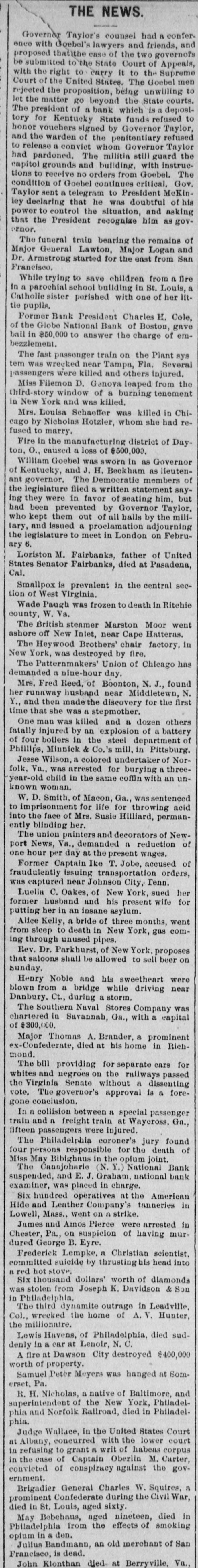 THE NEWS. Governor Taylor's counsel had A conferonce with Goebel's lawyers and friends, and proposed that the case of the two governofs be submitted to the State Court of Appeals, with the right to carry it to the Supreme Court of the United States. The Goebel men rejected the proposition, being unwilling to let the matter go beyond the State courts. The president of a bank which is a depository for Kentucky State funds refused to honor vouchers signed by Governor Taylor, and the warden of the penitentiary refused to release a convict whom Governor Taylor had pardoned. The militia still guard the capitol grounds and building. with instruetions to receive no orders from Goebel. The condition of Goebel continues critical. Gov. Taylor sent a telegram to President McKinley declaring that he was doubtful of his power to control the situation, and asking that the President recognize him as governor. The funeral train bearing the remains of Major General Lawton, Major Logan and Dr. Armstrong started for the east from San Francisco. While trying to save children from a fire in a parochial school building in St. Louis, a Catholic sister perished with one of her lit. tie pupils. Former Bank President Charles H. Cole, of the Globe National Bank of Boston, gave ball in $50,000 to answer the charge of embezzlement. The fast passenger train on the Plant sys tem was wrecked near Tampa, Fla. Several passengers were killed and others injured. Miss Filemon D. Genova leaped from the third-story window of a burning tenement in New York and Was killed. Mrs. Louisa Schaeffer was killed in Chicago by Nicholas Hotzler, whom she had refused to marry. Fire in the manufacturing district of Dayton, O., caused a loss of $500,000. William Goebel was sworn in as Governor of Kentucky, and J. H. Beckham as lieutenant governor. The Democratic members of the legislature filed & written statement saying they were in favor of seating him, but had been prevented by Governor Taylor. who kept them out of all balls by the military, and issued a proclamation adjourning the legislature to meet in London on February 6. Loriston M. Fairbanks, father of United States Senator Fairbanks, died at Pasadena, Cal. Smallpox is prevalent in the central section of West Virginia. Wade Paugh was frozen to death in Ritchie county, W. Va. The British steamer Marston Moor went ashore off New Inlet, near Cape Hatteras. The Heywood Brothers' chair factory. in New York, was destroyed by fire. The Patternmakers' Union of Chicago has demanded a nine-hour day. Mrs. Fred Reed, of Boonton, N. J., found her runaway husband near Middletewn, N. Y., and then made the discovery for the first time that she was a stepmother. One man was killed and a dozen others fatally injured by an explosion of a battery of four bollers in the steel department of Phillips, Minnick & Co.'s mill, in Pittsburg. Jesse Wilson, a colored undertaker of Norfolk. Va., was arrested for burying a threeyear-old child in the same coffin with an unknown woman. W. D. Smith. of Macon, Ga., wassentenced to imprisonment for life for throwing acid into the face of Mrs. Susie Hilliard, permanently blinding her. The union painters and decorators of Newport News, Va., demanded a reduction of one hour per day at the present wages. Former Captain Ike T. Jobe, accused of fraudulently Issuing transportation orders, was captured near Johnson City, Tenn. Luella C. Oakes, of New York, sued her former husband and his present wife for putting her in an insane asylum. Alice Kelly, a bride of three months, went from sleep to death in New York, gas coming through unused pipes. Rev. Dr. Parkhurst, of New York, proposes that saloons shall be allowed to sell beer on sunday. Henry Noble and his sweetheart were blown from a bridge while driving near Danbury. Ct., during a storm. The Southern Naval Stores Company was chartered in Savannah, Ga., with a capital of $300,000. Major Thomas A. Brander, a prominent ex-Confederate, died at his home in Richmond. The bill providing for separate cars for whites and negroes on the railways passed the Virginia Senate without A dissenting vote, The governor's approval is a foregone conclusion. In n collision between a special passenger train and n freight train at Wayeross. Ga., fifteen passengers were injured. The Philadelphia coroner's jury found four persons responsible for the death of Miss May Bibighaus in the opium joint. The Canajoharie (N. Y.) National Bank suspended, and E. J. Grabam. national bank examiner, was placed in charge. Six hundred operatives at the American Hide and Lenther Company's tanneries in Lowell, Mass., went on n strike. James and Amos Pierce were arrested in Chester, Pa., on suspicion of having murdured George B. Eyre. Frederick Lempke. a Christian scientist, committed suicide by thrusting head into a red hot stove. Six thousand dollars' worth of diamonds was stolen from Joseph K. Davidson & Son in Philadelphia, The third dynamite outrage in Leadville, Col., wrecked the home of A. V. Hunter, the millionnire. Lewis Havens, of Philadelphia, died suddenly in a car at Lenoir, N. C. A fire at Dawson City destroyed $400,000 worth of property. Samuel Peter Meyers was hanged at Somerset, Pa. R. H. Nicholas, a native of Baltimore, and superintendent of the New York, Philadelphia and Norfolk Railroad, died in Philadelphia. Judge Wallace, in the United States Court at Albany, concurred with the lower court in refusing to grant A writ of habeas corpus in the case of Captain Oberlin M. Carter, convicted of conspiracy against the government. Brigadier General Charles W. Squires, a prominent Confederate during the Civil War, died in St. Louis, aged sixty.