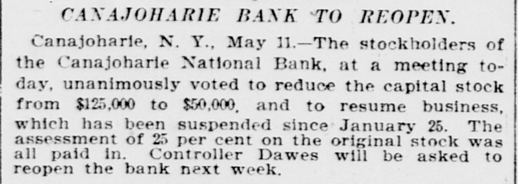 CANAJOHARIE BANK TO REOPEN. Canajoharie, N. Y., May 11.-The - stockholders of the Canajoharie National Bank, at a meeting today, unanimously voted to reduce the capital stock from $125,000 to $50,000. and to resume business, which has been suspended since January 25. The assessment of 25 per cent on the original stock was all paid in. Controller Dawes will be asked to reopen the bank next week.