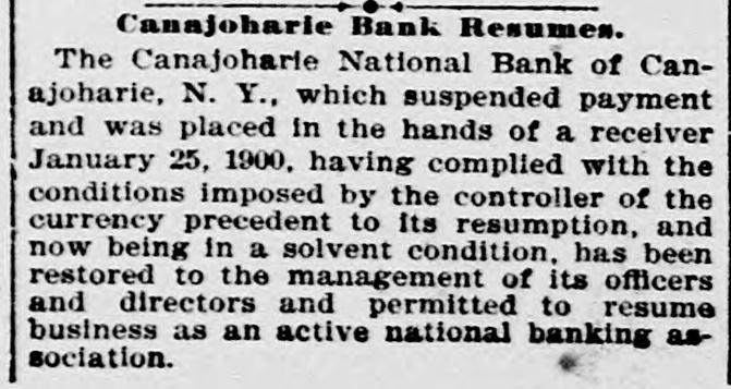 Canajoharie Bank Resumes. The Canajoharie National Bank of Canajoharie, N. Y., which suspended payment and was placed in the hands of a receiver January 25, 1900, having complied with the conditions imposed by the controller of the currency precedent to its resumption, and now being in a solvent condition, has been restored to the management of its officers and directors and permitted to resume business as an active national banking association.