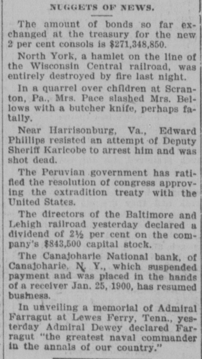 NUGGETS OF NEWS. The amount of bonds so far exchanged at the treasury for the new 2 per cent consols is $271,348,850. North York, a hamlet on the line of the Wisconsin Central railroad, was entirely destroyed by fire last night. In a quarrel over children at Scranton, Pa., Mrs. Pace slashed Mrs. Bellows with a butcher knife, perhaps fatally. Near Harrisonburg, Va., Edward Phillips resisted an attempt of Deputy Sheriff Karicobe to arrest him and was shot dead. The Peruvian government has ratifled the resolution of congress approving the extradition treaty with the United States. The directors of the Baltimore and Lehigh railroad yesterday declared a dividend of 2 1/2 per cent on the company's $843,500 capital stock. The Canajoharie National bank, of Canajoharie, N. Y., which suspended payment and was placed in the hands of a receiver Jan. 25, 1900, has resumed business. In unveiling a memorial of Admiral Farragut at Lewes Ferry, Tenn., yesterday Admiral Dewey declared Farragut "the greatest naval commander in the annals of our country."