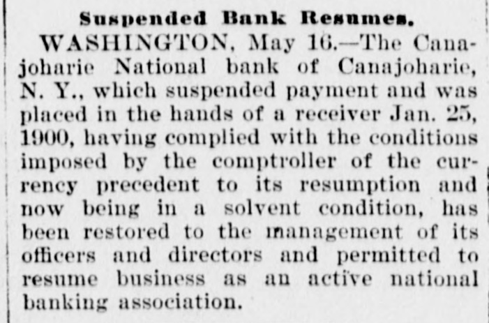 Suspended Bank Resumes. WASHINGTON, May 16.-The Canajoharie National bank of Canajoharie, N. Y., which suspended payment and was placed in the hands of a receiver Jan. 25, 1900, having complied with the conditions imposed by the comptroller of the currency precedent to its resumption and now being in a solvent condition, has been restored to the management of its officers and directors and permitted to resume business as an active national banking association.