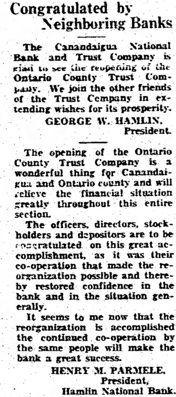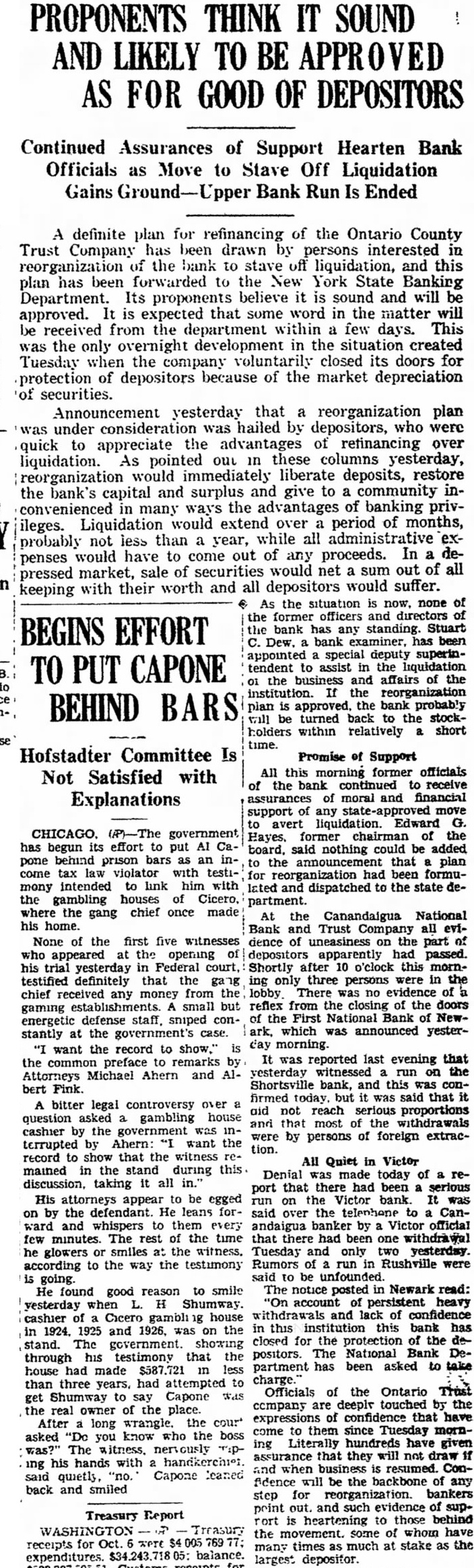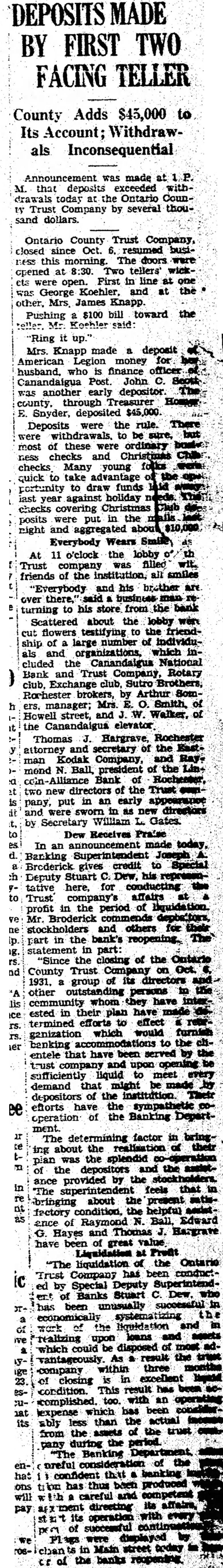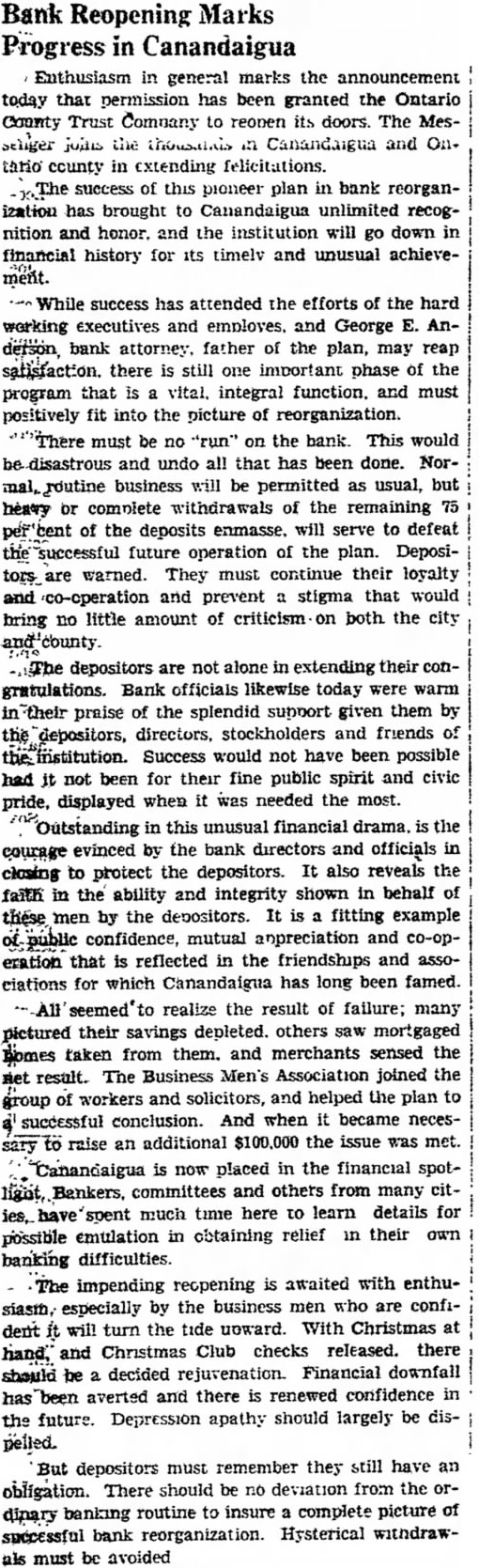 PROPONENTS THINK IT SOUND AND LIKELY TO BE AS FOR GOOD OF DEPOSITORS Continued Assurances of Support Hearten Bank Officials as Move to Stave Off Liquidation Gains Bank Run Is Ended A definite plan for refinancing of the Ontario County Trust Company has been drawn by persons interested in reorganization the bank to stave off liquidation, and this has been forwarded to the New York State Banking plan Department. Its proponents believe it is sound and will be approved. It is expected that some word in the matter will be received from the department within a few days. This was the only overnight development in the situation created Tuesday when the company voluntarily closed its doors for protection of depositors because of the market depreciation of securities. Announcement yesterday that a reorganization plan was under consideration was hailed by depositors, who were to the advantages of refinancing over quick appreciate liquidation. As pointed out these columns yesterday, reorganization would immediately liberate deposits, restore the bank's capital and surplus and give to a community inin many ways the advantages of banking privileges. Liquidation would extend over period of months, probably not less than a year, while all administrative exof In dewould have to come out any proceeds. penses pressed market, sale of securities would net a sum out of all worth and all depositors would suffer. keeping with their the situation none of As the former officers and directors EFFORT the bank has any standing. Stuart Dew. bank examiner, been appointed special deputy superintendent to assist in the liquidation the business and affairs of the institution. If the reorganization BEHIND plan is approved. the bank probably will be turned back to the stockholders within relatively short time. Promise Support All this morning former officials the bank continued to receive assurances of moral and financial support any move avert Edward Hayes. former chairman the board. said nothing could be added that plan reorganization had been formudispatched to the state department. At the Canandaigua National Bank Trust Company all evidence of the part of depositors apparently had passed. Shortly after 10 o'clock this ing only three persons were in the lobby There no reflex from the closing the of the First Bank Newwhich announced yesterday morning. was reported last evening that yesterday witnessed run on the Shortsville bank, and this was confirmed but was said that aid not reach serious proportions and that most of the withdrawals were by persons of foreign extraction. All Quiet in Victor Denial made today of port that there had been serious on Victor bank was said over the Canbanker by Victor official that there had been withdrawal Tuesday and only two yesterday. Rumors Rushville were said to be The notice posted Newark read: account persistent heavy and of confidence in this institution this bank has closed for the protection of the positors. The National Bank partment has been asked to take charge." Officials of the Ontario Trust company deeply touched by the expressions of confidence that have come them since Tuesday morning Literally hundreds have given assurance that they will not draw when business resumed ConAdence will the backbone step for reorganization bankers point and such evidence is heartening to those behind the some of whom have times as much at stake the many largest