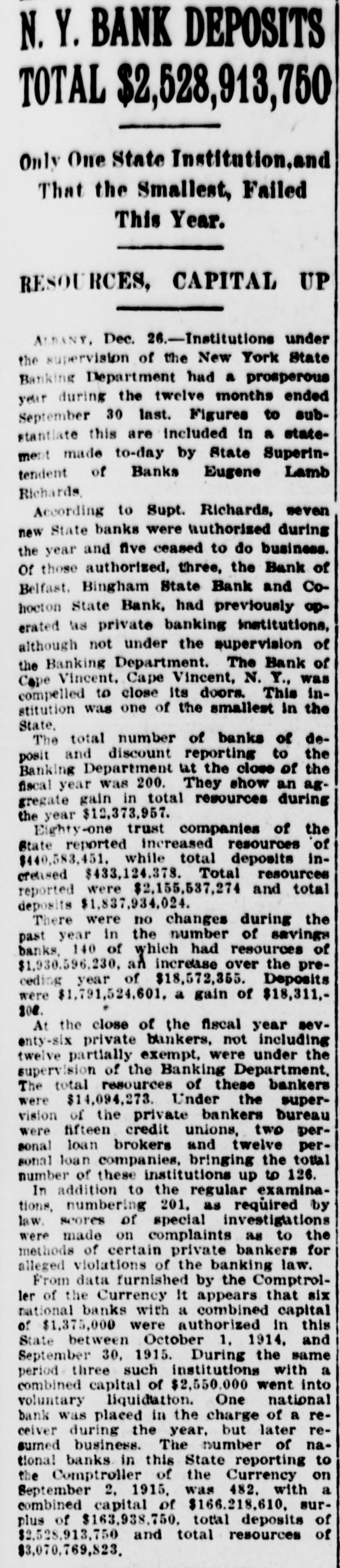 # N. Y. BANK DEPOSITS TOTAL $2,528,913,750 Only One State Institution, and That the Smallest, Failed This Year. # RESOURCES, CAPITAL UP ALBANY, Dec. 26. -Institutions under the supervision of the New York State Banking Department had a prosperous year during the twelve months ended September 30 last. Figures to substantiate this are included in a statement made to-day by State Superintendent of Banks Eugene Lamb Richards. According to Supt. Richards, seven new State banks were authorized during the year and five ceased to do business. Of those authorized, three, the Bank of Belfast, Bingham State Bank and Cohocton State Bank, had previously operated as private banking institutions, although not under the supervision of the Banking Department. The Bank of Cape Vincent, Cape Vincent, N. Y., was compelled to close its doors. This institution was one of the smallest in the State. The total number of banks of deposit and discount reporting to the Banking Department at the close of the fiscal year was 200. They show an aggregate gain in total resources during the year $12,373,957. Eighty-one trust companies of the State reported increased resources of $440,583,451, while total deposits increased $433,124.378. Total resources reported were $2,155,537,274 and total deposits $1,837,934,024. There were no changes during the past year in the number of savings banks, 140 of which had resources of $1,930.596.230, an increase over the preceding year of $18,572,355. Deposits were $1,791,524,601, a gain of $18,311,202. At the close of the fiscal year seventy-six private bankers, not including twelve partially exempt, were under the supervision of the Banking Department, The total resources of these bankers were $14,094,273. Under the supervision of the private bankers bureau were fifteen credit unions, two personal loan brokers and twelve personal loan companies, bringing the total number of these institutions up to 126. In addition to the regular examinations, numbering 201, as required by law, scores of special investigations were made on complaints as to the methods of certain private bankers for alleged violations of the banking law. From data furnished by the Comptroller of the Currency it appears that six national banks with a combined capital of $1,375,000 were authorized in this State between October 1, 1914, and September 30, 1915. During the same period three such institutions with a combined capital of $2,550,000 went into voluntary liquidation. One national bank was placed in the charge of a receiver during the year, but later resumed business. The number of national banks in this State reporting to the Comptroller of the Currency on September 2, 1915, was 482, with a combined capital of $166.218,610, surplus of $163,938,750, total deposits of $2,528,913,750 and total resources of $3,070,769,823,