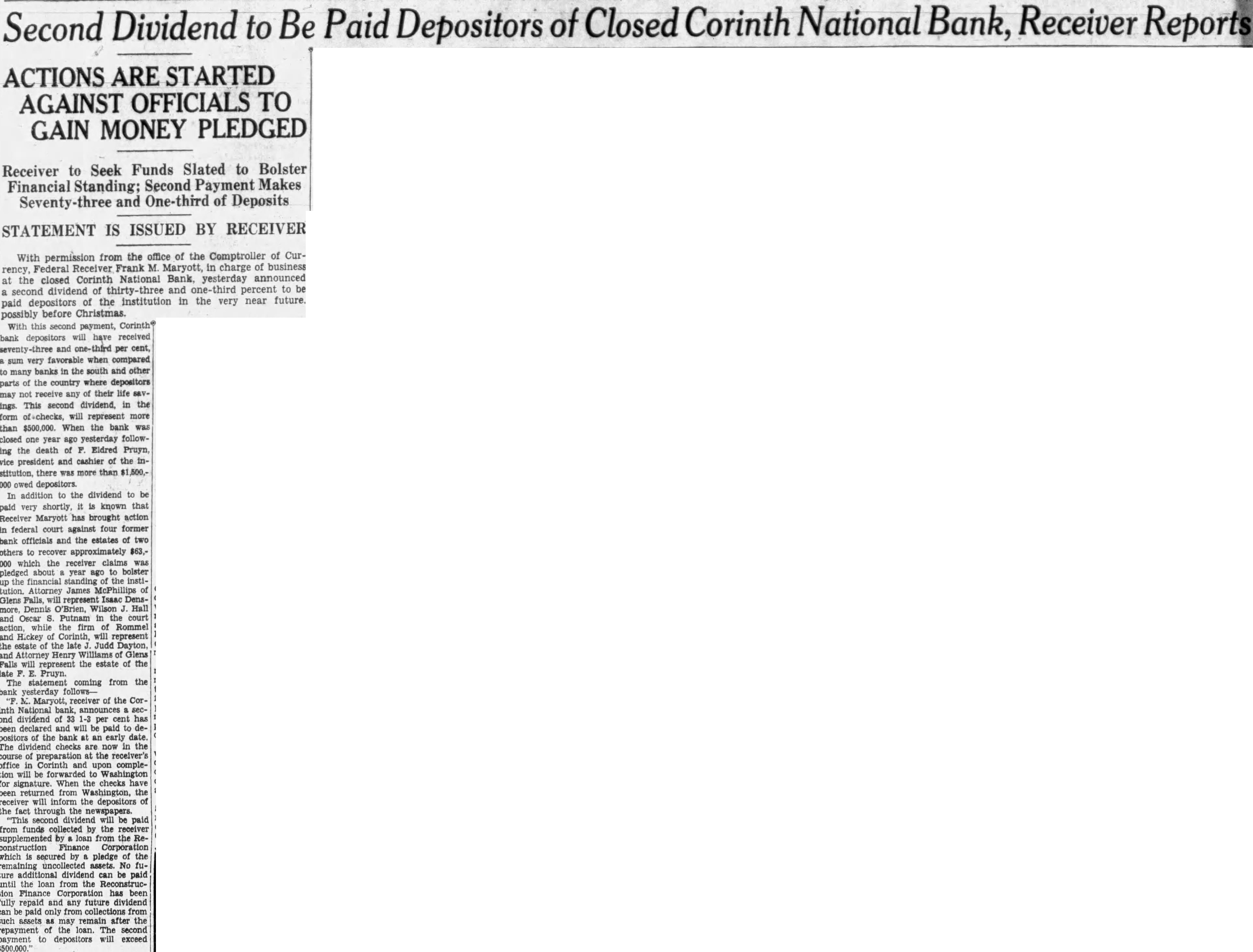 Second Dividend to Be Paid Depositors of Closed Corinth National Bank, Receiver Reports ACTIONS ARE STARTED AGAINST OFFICIALS TO GAIN MONEY PLEDGED Receiver to Seek Funds Slated to Bolster Financial Standing; Second Payment Makes Seventy-three and One-third of Deposits STATEMENT IS ISSUED BY RECEIVER With permission from the office of the Comptroller of Currency, Federal Receiver Frank M. Maryott, in charge of business at the closed Corinth National Bank, yesterday announced a second dividend of thirty-three and one-third percent to be paid depositors of the institution in the very near future. possibly before Christmas. With this second payment, Corinth bank depositors will have received seventy-three and one-third per cent, a sum very favorable when compared to many banks in the south and other parts of the country where depositors may not receive any of their life savings This second dividend, in the form of checks, will represent more than $500,000. When the bank was closed one year ago yesterday following the death of F. Eldred Pruyn, vice president and cashier of the institution, there was more than $1,500.000 owed depositors. In addition to the dividend to be paid very shortly, it is known that Receiver Maryott has brought action in federal court against four former bank officials and the estates of two others to recover approximately $63,000 which the receiver claims was pledged about a year ago to bolster up the financial standing of the institution. Attorney James McPhillips of Glens Falls, will represent Isaac Densmore, Dennis O'Brien, Wilson J. Hall and Oscar S. Putnam in the court action, while the firm of Rommel and Hickey of Corinth, will represent the estate of the late J. Judd Dayton, and Attorney Henry Williams of Glens Falls will represent the estate of the late F. E. Pruyn. The statement coming from the bank yesterday follows"F. M. Maryott, receiver of the Corinth National bank, announces second dividend of 33 1-3 per cent has been declared and will be paid to depositors of the bank at an early date. The dividend checks are now in the course of preparation at the receiver's office in Corinth and upon completion will be forwarded to Washington for signature. When the checks have been returned from Washington, the receiver will inform the depositors of the fact through the newspapers. "This second dividend will be paid from funds collected by the receiver supplemented by loan from the Reconstruction Finance Corporation which is secured by a pledge of the remaining uncollected assets. No future additional dividend can be paid until the loan from the Reconstruction Finance Corporation has been fully repaid and any future dividend can be paid only from collections from such assets as may remain after the repayment of the loan. The second payment to depositors will exceed $500,000."