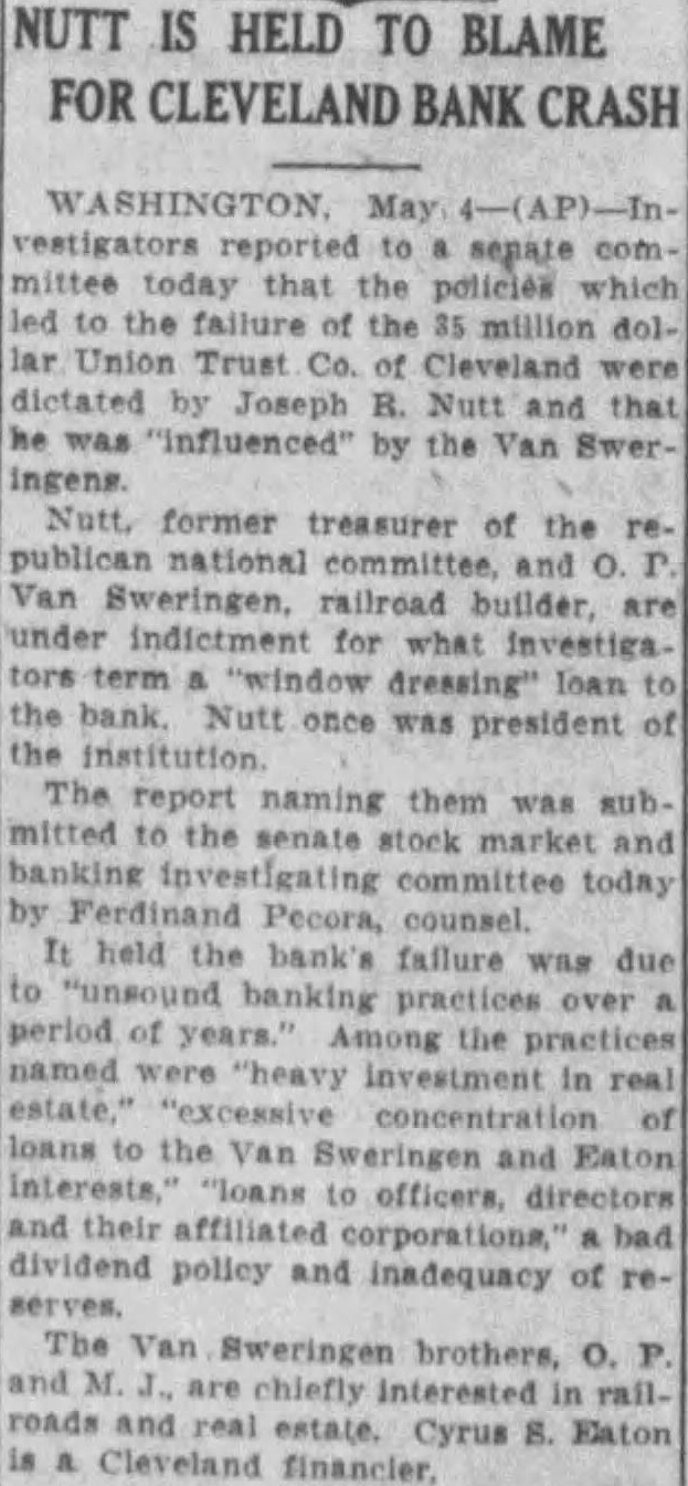May to senate mittee that the policies to the failure the million dol. Union Trust Co. Cleveland dictated Joseph R. Nutt he by the Van SwerNutt, former treasurer of the publican national committee. and Van Sweringen, railroad builder under indictment for what investiga. tors term "window dressing" loan the Nutt once was president institution The report naming them was sub. mitted the senate stock market banking committee today Ferdinand Pecora, counsel. held the bank's failure due was banking period Among the named were investment in loans the Van and "loans and their affiliated bad policy and inadequacy of serves. The Sweringen brothers, chiefly and real estate. Cyrus Eaton Cleveland