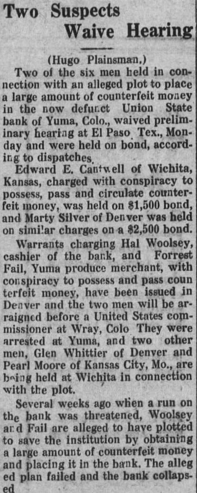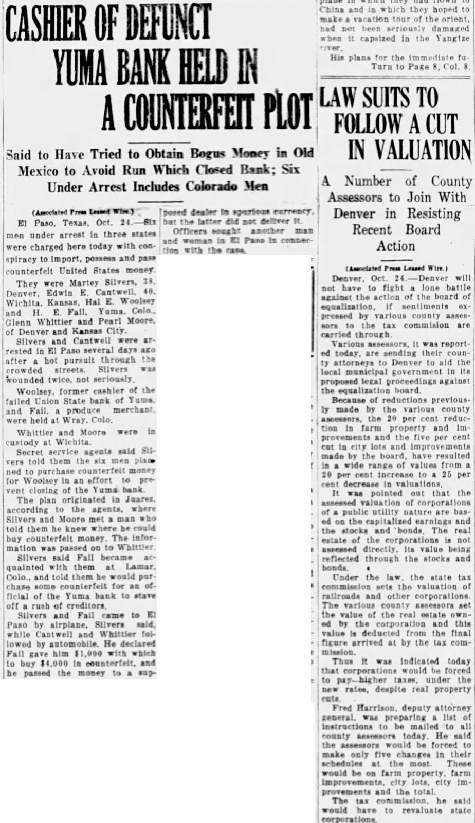 CASHIER OF DEFUNCT YUMA BANK HELD IN LAW SUITS TO A COUNTERFEIT PLOT FOLLOW A CUT IN VALUATION Said to Have Tried to Obtain Bogus Money in Old Mexico to Avoid Run Which Closed Bank; Six Under Arrest Includes Colorado Men (Associated Press Leased Paso, Oct. men under arrest in three states were charged here today with conspiracy to import, possess and pass counterfeit United States money They were Martey Silvers, 38. Denver, Edwin Cantwell. 40. Wichita. Kansas, Hal E. Woolsey Colo., and Glenn Whittier and Pearl Moore, of Denver and Kansas City. Silvers and Cantwell were arrested in El Paso several days ago after hot pursuit through the crowded streets. Silvers was wounded twice, not seriously. Woolsey. former cashier of the failed Union State bank of Yuma, and Fail. produce were held Wray. Colo. and Moore were in custody Secret service agents said vers told them the six ned to purchase counterfeit money for Woolsey in an effort vent closing of the Yuma bank. The plan originated in according to the agents, where Silvers and Moore met told them he knew where could buy counterfeit The information was passed to Silvers said Fail became quainted with them at Lamar. Colo., and told them would pur chase some counterfeit for an official of Yuma bank to stave Silvers and Fail came to Paso airplane, Silvers said, while Cantwell and lowed by automobile. He declared with which to buy in and he passed the money but the latter did not deliver Officers sought another man and woman El Paso in connecwith the A Number of County Assessors to Join With Denver in Resisting Recent Board Action (Associated Press Leased Denver, Oct. will not have to fight lone battle against action of the board of equalization, sentiments expressed by various county assessors to the tax commision are carried through Various assessors, It was reported today. are sending their counattorneys to Denver to aid the local municipal government in its proposed legal proceedings against the equalization board. Because of reductions previously made by the various county the per reduction in farm property and imand the five per cent cut in lots and by the board, have resulted in wide range of values from 20 per cent 25 per in valuations. It was pointed out that the of corporations of public utility are based on the capitalized earnings and the and bonds The real estate of the corporations not assessed directly, its value being reflected through the stocks and Under the law. the state tax commission sets the valuation railroads and other corporations. The various county assessors set the value the real estate ownby corporation and this value deducted from the final figure arrived at by the tax commission. Thus It was indicated today that corporations would forced to taxes, under the new rates, despite real property Fred Harrison. deputy attorney general. preparing list instructions to be mailed to all county assessors today. He said the assessors would be forced to make only five changes in their schedules at the most. These would be on farm property. farm improvements, city lots, city Improvements and the total The tax commission. he said would to revaluate state corporations,