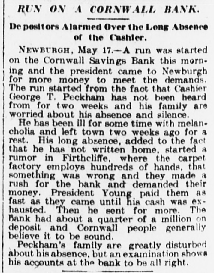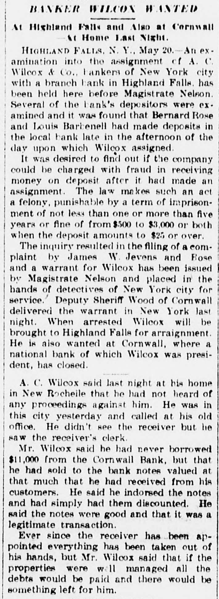 BANKER WILCOX WANTED At Highland Falls and Also at Cornwall " Home Last Night. HIGHLAND FALLS. N. Y., May 20.-An examination into the assignment of A. C. Wilcox & Co., bankers of New York city with a branch bank in Highland Falls. has been held here before Magistrate Nelson. Several of the bank's depositors were examined and it was found that Bernard Rose and Louis Barbenell had made deposits in the local bank late in the afternoon of the day upon which Wilcox assigned. It was desired to find out if the company could be charged with fraud in receiving money on deposit after it had made an assignment. The law makes such an act a felony, punishable by a term of imprisonment of not less than one or more than five years or fine of from $500 to $3,000 or both when the deposit amounts to $25 or over. The inquiry resulted in the filing of a complaint by James W. Jevens and Bose and a warrant for Wilcox has been issued by Magistrate Nelson and placed in the hands of detectives of New York city for service. Deputy Sheriff Wood of Cornwall delivered the warrant in New York last night. When arrested Wilcox will be brought to Highland Falls for arraignment. He is also wanted at Cornwall, where a national bank of which Wilcox was president, has closed. A. C. Wilcox said last night at his home in New Rocheile that he had not heard of any proceedings against him. He was in this city yesterday and called at his old office. He didn't see the receiver but he saw the receiver's clerk. Mr. Wilcox said he had never borrowed $11,000 from the Cornwall Bank, but that he had sold to the bank notes valued at that much that he had received from his customers. He said he indorsed the notes and had simply had them discounted. He said the notes were good and that it was a legitimate transaction. Ever since the receiver has been appointed everything has been taken out of his hands, but Mr. Wilcox said that if the properties were will managed all the debts would be paid and there would be something left for him.