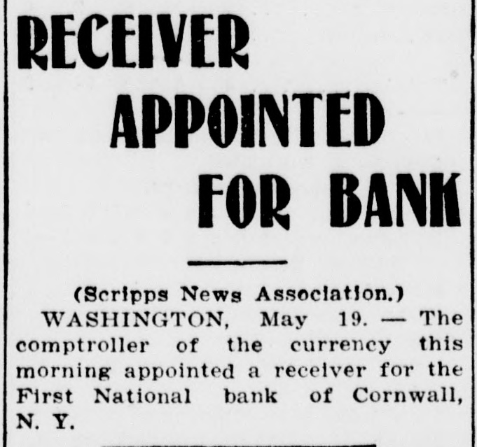 RECEIVER APPOINTED FOR BANK (Scripps News Association.) WASHINGTON, May 19. - The comptroller of the currency this morning appointed a receiver for the First National bank of Cornwall, N. Y.