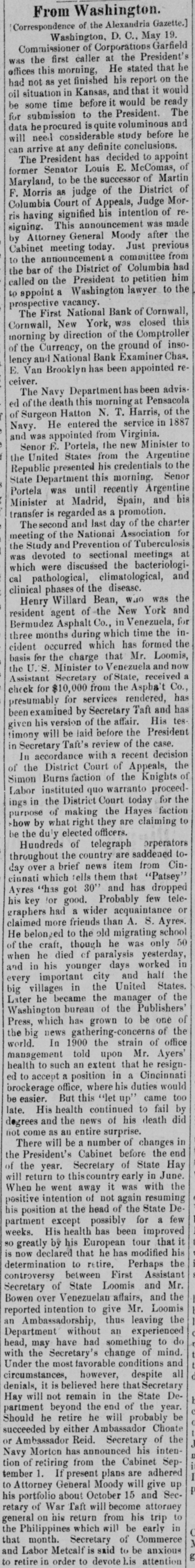 шолд spondence of the Alexandria Gazette.] Washington, D. C., May 19. missioner of Corporations Garfield he first caller at the President's this morning, He stated that he t as yet finished his report on the ation in Kansas, and that it would me time before it would be ready bmission to the President. The e procured isquite voluminous and eed considerable study before he rive at any definite conclusions. President has decided to appoint Senator Louis E. McComas, of and, to be the successor of Martin rris as judge of the District of bia Court of Appeals, Judge Morving signified his intention of reg. This announcement was made torney General Moody after the et meeting today. Just previous announcement a committee from r of the District of Columbia had on the President to petition him oint a Washington lawyer to the ctive vacancy. First National Bank of Cornwall, all, New York, was closed this ng by direction of the Comptroller Currency, on the ground of insoand National Bank Examiner Chas. n Brooklyn has been appointed reNavy Department has been advishe death this morning at Pensacola geon Hatton N. T. Harris, of the He entered the service in 1887 as appointed from Virginia. or E. Portela, the new Minister to nited States from the Argentine olic presented his credentials to the Department this morning. Senor a was until recently Argentine ter at Madrid, Spain, and his promotton. B su гедавер 8! 19 second and last day of the charter g of the National Association for udy and Prevention of Tuberculosis levoted to sectional meetings at were discussed the bacteriologiathological, elimatological, and l phases of the disease. ary Willard Bean, who was the nt agent of -the New York and idez Asphalt Co., in Venezuela, for months during which time the inoccurred which has formed the for the charge that Mr. Loomis, S. Minister to Venezuela and now ant Secretary of State, received a for $10,000 from the Aspha't Co., nably for services rendered, has xamined by Secretary Taft and has his version of the affair. His tes7 will be laid before the President retary Taft's review of the case. accordance with a recent decision e District Court of Appeals, the Burns faction of the Knights of instituted quo warranto proceed3 the District Court today for the se of making the Hayes faction by what right they are claiming to duly elected officers. adreds of telegraph orperators ghout the country are saddened toer a brief news item from Cini which tells them that "Patsey" "has got 30" and has dropped y !or good. Probably few telers had a wider acquaintance or d more friends than A. S. Ayres. longed to the old migrating school craft, though he was only 50 he died of paralysis yesterday, ) his younger days worked in important city and half the illages in the United States. he became the manager of the ngton bureau of the Publishers' which has grown to be one of ( news gathering-concerns of the In 1900 the strain of office