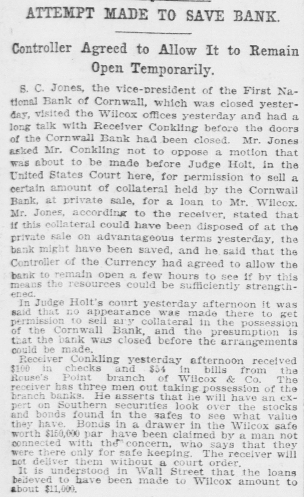 ATTEMPT MADE TO SAVE BANK. Controller Agreed to Allow It to Remain Open Temporarily. S. C. Jones, the vice-president of the First National Bank of Cornwall, which was closed yesterday, visited the Wilcox offices yesterday and had a long talk with Receiver Conkling before the doors of the Cornwall Bank had been closed. Mr. Jones asked Mr. Conkling not to oppose a motion that was about to be made before Judge Holt, in the United States Court here, for permission to sell a certain amount of collateral held by the Cornwall Bank, at private sale, for a loan to Mr. Wilcox. Mr. Jones, according to the receiver, stated that if this collateral could have been disposed of at the private sale on advantageous terms yesterday, the bank might have been saved, and he said that the Controller of the Currency had agreed to allow the bank to remain open a few hours to see if by this means the resources could be sufficiently strengthened. In Judge Holt's court yesterday afternoon it was said that no appearance was made there to get permission to sell ary collateral in the possession of the Cornwall Bank, and the presumption is that the bank was closed before the arrangements could be made. Receiver Conkling yesterday afternoon received $100 in checks and $54 in bills from the Rouse's Point branch of Wilcox & Co. The receiver has three men out taking possession of the branch banks. He asserts that he will have an expert on Southern securities look over the stocks and bonds found in the safes to see what value they have. Bonds in a drawer in the Wilcox safe worth $150,000 par have been claimed by a man not connected with the concern, who says that they were there only for safe keeping. The receiver will not deliver them without a court order. It is understood in Wall Street that the loans believed to have been made to Wilcox amount to about $11,000.