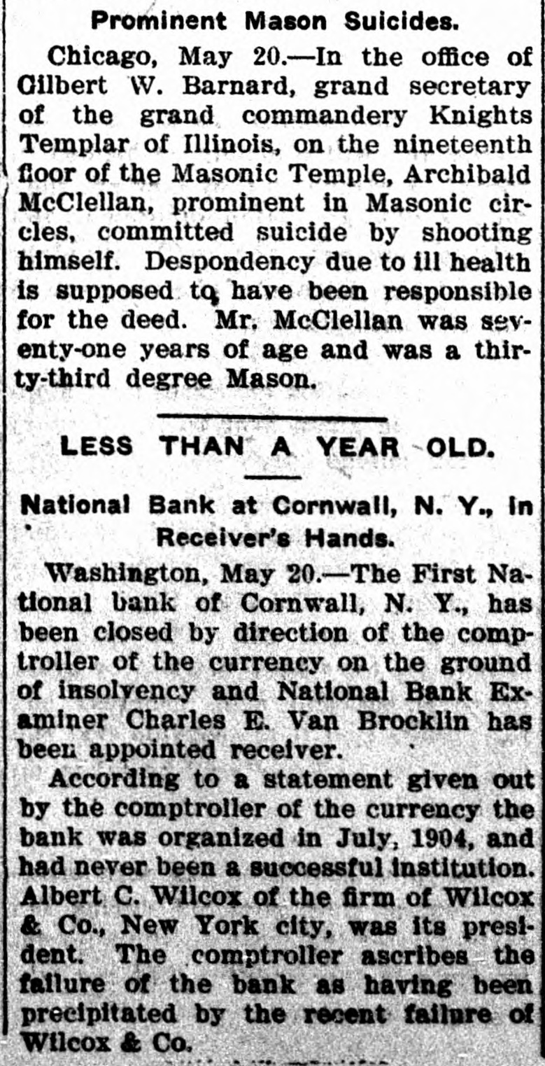 Prominent Mason Suicides. Chicago, May 20.-In the office of Gilbert W. Barnard, grand secretary of the grand commandery Knights Templar of Illinois, on the nineteenth floor of the Masonic Temple, Archibald McClellan, prominent in Masonic circles, committed suicide by shooting himself. Despondency due to ill health is supposed to, have been responsible for the deed. Mr. McClellan was seventy-one years of age and was a thirty-third degree Mason. LESS THAN A YEAR OLD. National Bank at Cornwall, N. Y., in Receiver's Hands. Washington, May 20.-The First National bank of Cornwall, N. Y., has been closed by direction of the comptroller of the currency on the ground of insolvency and National Bank Examiner Charles E. Van Brocklin has been appointed receiver. According to a statement given out by the comptroller of the currency the bank was organized in July, 1904, and had never been a successful institution. Albert C. Wilcox of the firm of Wilcox & Co., New York city, was its president. The comptroller ascribes the failure of the bank as having been precipitated by the recent failure of Wilcox & Co.