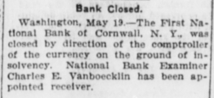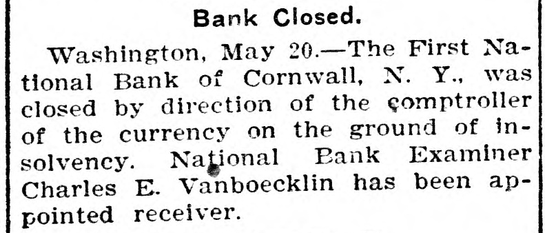 Bank Closed. Washington, May 19.-The First National Bank of Cornwall, N. Y., was closed by direction of the comptroller of the currency on the ground of insolvency. National Bank Examiner Charles E. Vanboecklin has been appointed receiver.
