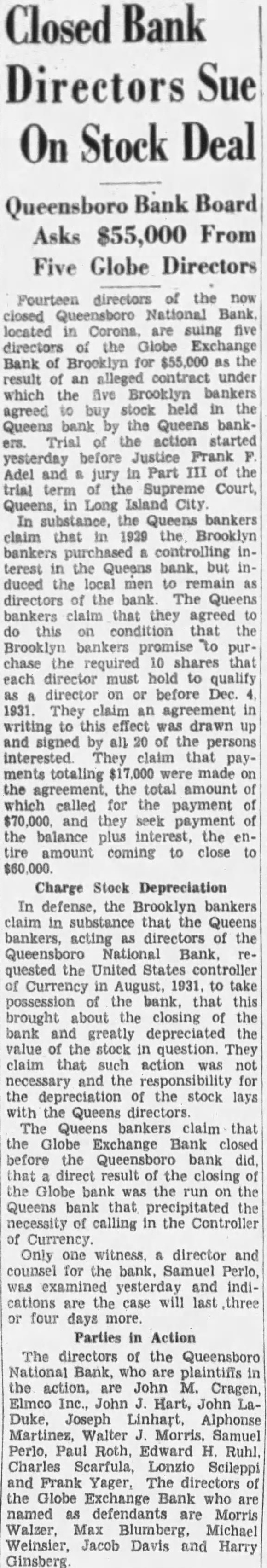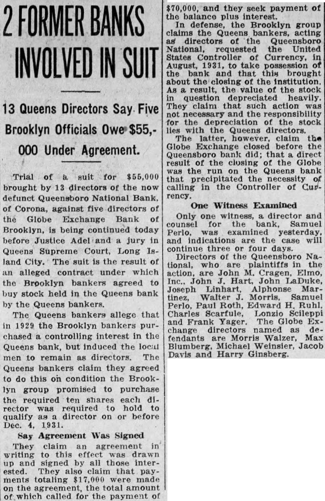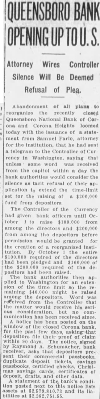 BANK OPENING UP Attorney Wires Controller Silence Will Be Deemed Refusal of Plea. Abandonment of all plans to reorganize recently closed Queensboro National Bank of CorCorona Heights loomed today with issuance of statement from Samuel Parlo, attorney for institution, that he had sent a the Controller of Currency in Washington, saying that unless was from capitol within day the bank authorities would consider the silence as tacit refusal of their ap. plication to extend the limit set for the raising of a $200,000 fund from depositors. The Controller of the Currency had given bank until October to raise $100,000 from among the and from the depositors before permission would be granted for the creation of reorganized institution. By entire of the directors had pledged of required the dehad The bank authorities then applied to Washington for an extension of the time limit the maining might be raised among Word was received the Controller that the matter would his serious no communication has been since notice has been posted on the of the for the depositors file their proof within 90 days. notice, signed by Raymond Schumacher, bank receiver, that depositors preduplicate deposit savings passbooks, certified checks, Christmas cards, certificates of deposit, drafts, and other data. statement of the bank's condition posted next to this notice lists assets at and its liabilities at $2,282,751.55