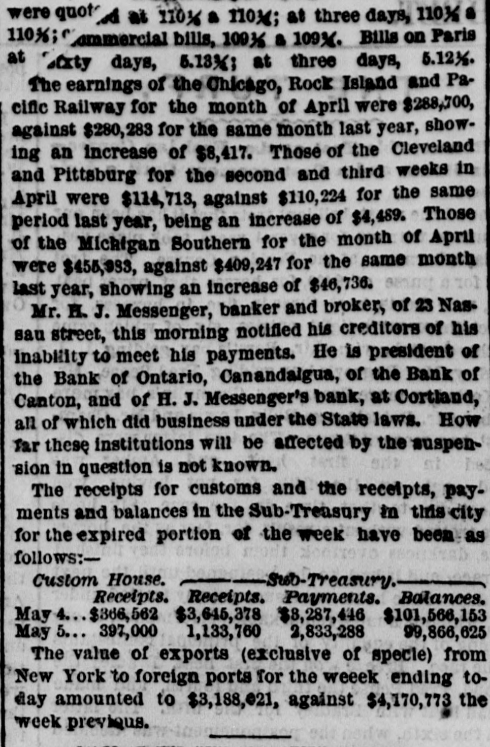 were quot s at 110% nox; at three days, 1101/ a 110%; ammercial bills, 1001/ a 109%. Bills on Paris at 'Styty days, 5.13%; at three days, 5.121/. The earnings of the Chicago, Rock Island and Pacific Railway for the month of April were $288,700, against $280,283 for the same month last year, showing an increase of $8,417. Those of the Cleveland and Pittsburg for the second and third weeks in April were $114,713, against $110,224 for the same period last year, being an increase of $4,489. Those of the Michigan Southern for the month of April were $455,933, against $409,247 for the same month last year, showing an increase of $46,736. Mr. H. J. Messenger, banker and broker, of 23 Nas. sau street, this morning notified his creditors of his inability to meet his payments. He is president of the Bank of Ontario, Canandaigua, of the Bank of Canton, and of H. J. Messenger's bank, at Cortland, all of which did business under the State laws. How far these institutions will be affected by the suspension in question is not known. The receipts for customs and the receipts, payments and balances in the Sub-Treasury in this city for the expired portion of the week have been as follows:Custom House. Sub-Treasury. Receipts. Receipts. Payments. Balances. $366,562 $3,645,378 $8,287,446 May 4. $101,566,153 397,000 2,833,288 1,133,760 May 5. 99,866,625 The value of exports (exclusive of specie) from New York to foreign ports for the weeek ending today amounted to $3,188,021, against $4,170,773 the week previous.