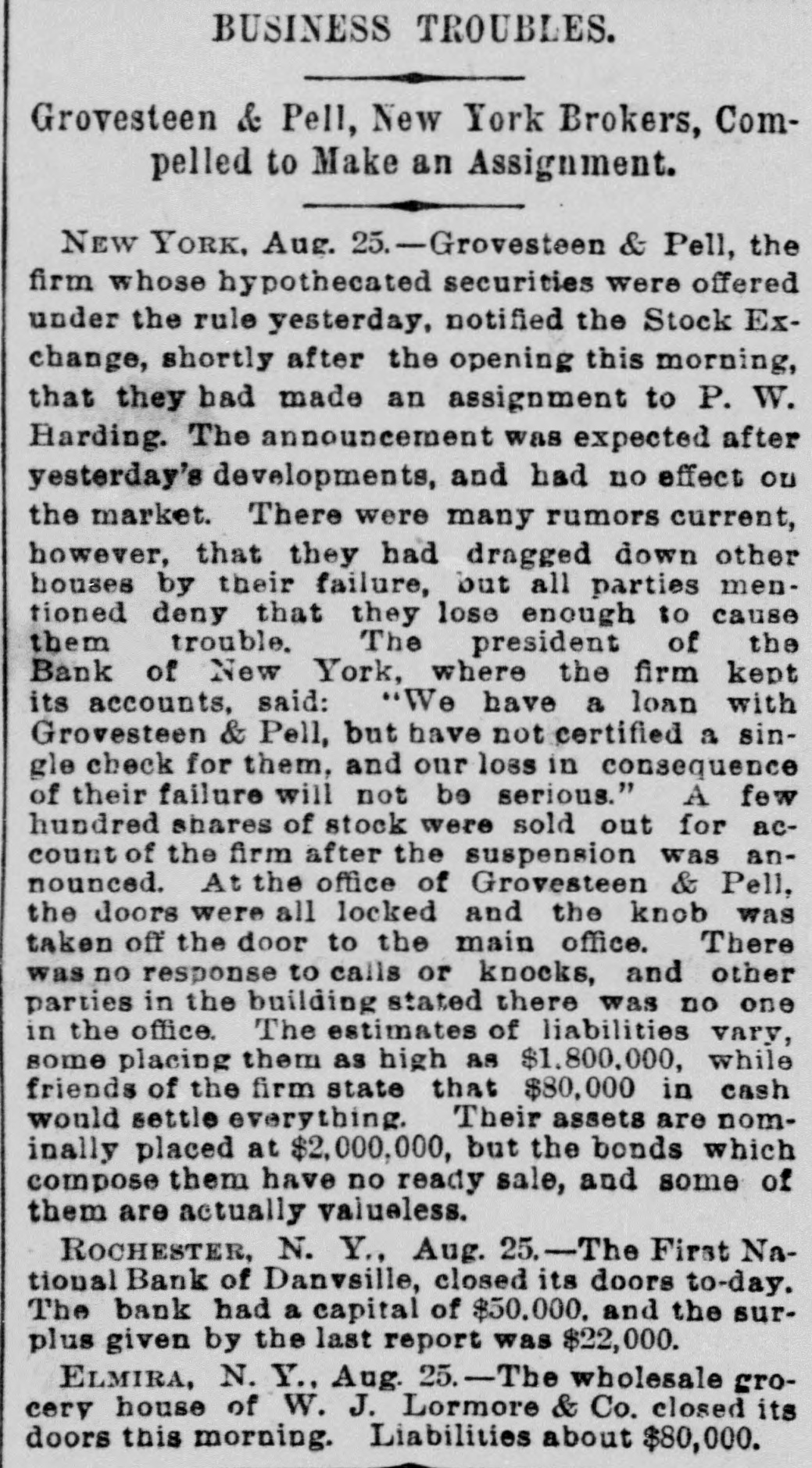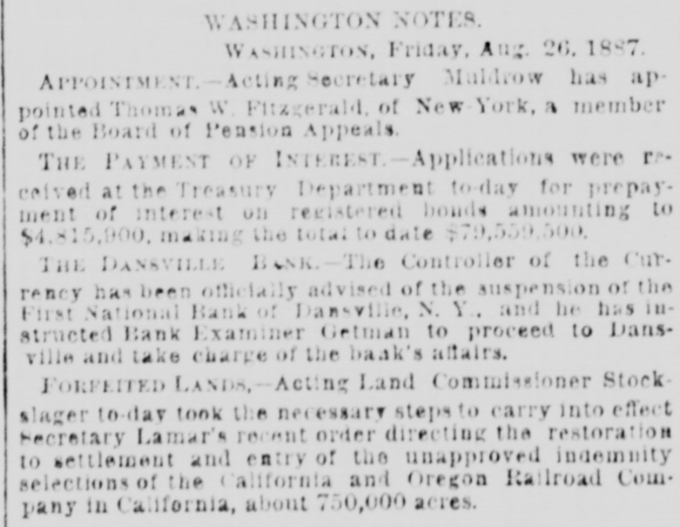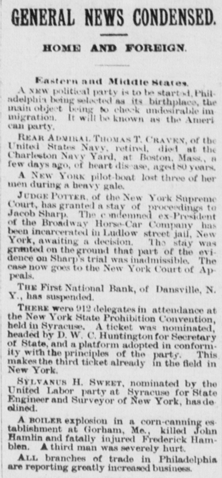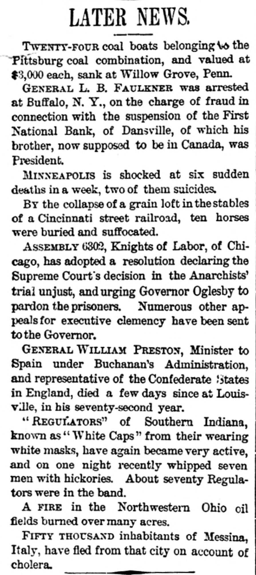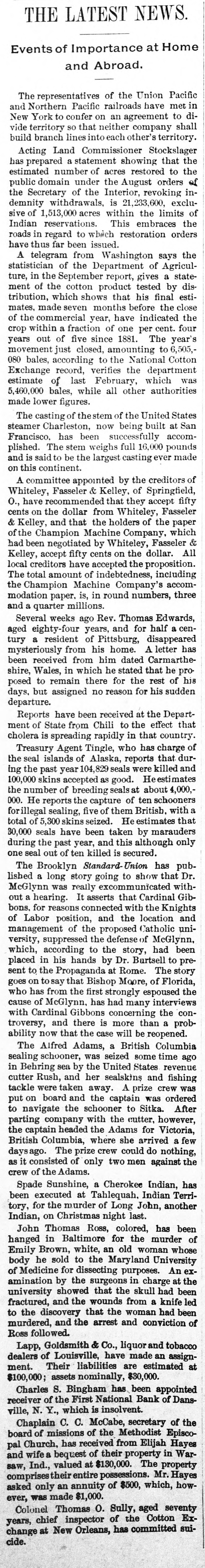 THE LATEST NEWS. Events of Importance at Home and Abroad. The representatives of the Union Pacific and Northern Pacific railroads have met in New York to confer on an agreement to divide territory so that neither company shall build branch lines into each other's territory. Acting Land Commissioner Stockslager has prepared a statement showing that the estimated number of acres restored to the public domain under the August orders of the Secretary of the Interior, revoking indemnity withdrawals, is 21,233,600, exclusive of 1,513,000 acres within the limits of Indian reservations. This embraces the roads in regard to whech restoration orders have thus far been issued. A telegram from Washington says the statistician of the Department of Agriculture, in the September report, gives a statement of the cotton product tested by distribution, which shows that his final estimates, made seven months before the close of the commercial year, have indicated the crop within a fraction of one per cent. four years out of five since 1881. The year S movement just closed, amounting to 6,505,080 bales, according to the National Cotton Exchange record, verifies the department estimate of last February, which was 5,460,000 bales, while all other authorities made lower figures. The casting of thestem of the United States steamer Charleston, now being built at San Francisco, has been successfully accomplished. The stem weighs full 16,000 pounds and is said to be the largest casting ever made on this continent. A committee appointed by the creditors of Whiteley, Fasseler & Kelley, of Springfield, O., have recommended that they accept fifty cents on the dollar from Whiteley, Fasseler & Kelley, and that the holders of the paper of the Champion Machine Company, which had been negotiated by Whiteley, Fasseler & Kelley, accept fifty cents on the dollar. All local creditors have accepted the proposition. The total amount of indebtedness, including the Champion Machine Company's accommodation paper. is, in round numbers, three and a quarter millions. Several weeks ago Rev. Thomas Edwards, aged eighty-four years, and for half century a resident of Pittsburg, disappeared mysteriously from his home. A letter has been received from him dated Carmartheshire, Wales, in which he stated that he proposed to remain there for the rest of his days, but assigned no reason for his sudden departure. Reports have been received at the Department of State from Chili to the effect that cholera is spreading rapidly in that country. Treasury Agent Tingle, who has charge of the seal islands of Alaska, reports that during the past year 104,829 seals were killed and 100,000 skins accepted as good. He estimates the number of breeding seals at about 4,000,000. He reports the capture of ten schooners forillegal sealing, five of them British, with total of 5,300 skins seized. He estimates that 30,000 seals have been taken by marauders during the past year, and this although only one seal out of ten killed is secured. The Brooklyn Standard-Union has published a long story going to show that Dr. McGlvnn was really excommunicated without a hearing. It asserts that Cardinal Gibbons, for reasons connected with the Knights of Labor position, and the location and management of the proposed Catholic university, suppressed the defense of McGlynn, which, according to the story, had been placed in his hands by Dr. Burtsell to present to the Propaganda at Rome. The story goes on to say that Bishop Moore, of Florida, who has from the first strongly espoused the cause of McGlynn, has had many interviews with Cardinal Gibbons concerning the controversy, and there is more than a probability now that the case will be reopened. The Alfred Adams, a British Columbia sealing schooner, was seized some time ago in Behring sea by the United States revenue cutter Rush, and her sealskins and fishing tackle were taken away. A prize crew was put on board and the captain was ordered to navigate the schooner to Sitka. After parting company with the cutter, however, the captain headed the Adams for Victoria, British Columbia, where she arrived a few daysago. The prize crew could do nothing, as it consisted of only two men against the crew of the Adams. Spade Sunshine, a Cherokee Indian, has been executed at Tahlequah, Indian Territory, for the murder of Long John, another Indian, on Christmas night last. John Thomas Ross, colored, has been hanged in Baltimore for the murder of Emily Brown, white, an old woman whose body he sold to the Maryland University of Medicine for dissecting purposes. An examination by the surgeons in charge at the university showed that the skull had been fractured, and the wounds from a knife led to the discovery that the woman had been murdered, and the arrest and conviction of Ross followed. Lapp, Goldsmith & Co., liquor and tobacco dealers of Louisville, have made an assignment. Their liabilities are estimated at $100,000; assets nominally, $30,000. Charles S. Bingham has been appointed receiver of the First National Bank of Dansville, N. Y., which is insolvent. Chaplain C. C. McCabe, secretary of the board of missions of the Methodist Episcopal Church, has received from Elijah Hayes and wife a bequest of their property in Warsaw, Ind., valued at $130,000. The property comprises their entire possessions. Mr. Hayes asked only an annuity of $500, which, however, was made $1,000. Colonel Thomas o. Sully, aged seventy years, chief inspector of the Cotton Exchange at New Orleans, has committed suicide.