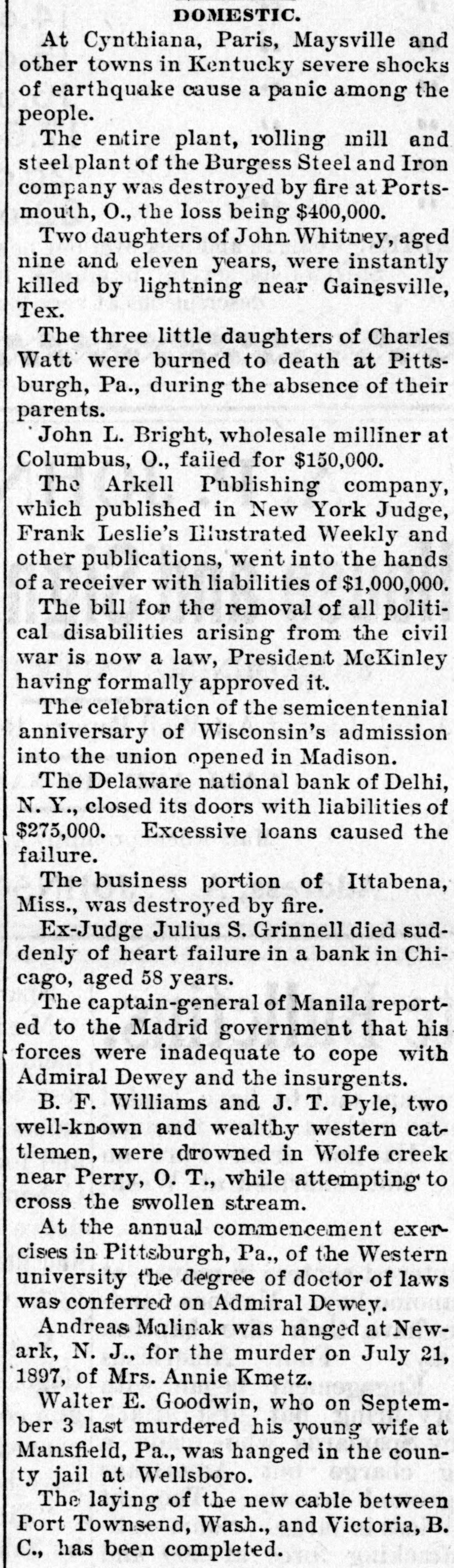 DOMESTIC. At Cynthiana, Paris, Maysville and other towns in Kentucky severe shocks of earthquake cause a panic among the people. The entire plant, rolling mill and steel plant of the Burgess Steel and Iron company was destroyed by fire at Portsmouth, O., the loss being $400,000. Two daughters of John. Whitney, aged nine and eleven years, were instantly killed by lightning near Gainesville, Tex. The three little daughters of Charles Watt were burned to death at Pittsburgh, Pa., during the absence of their parents. John L. Bright, wholesale milliner at Columbus, O., failed for $150,000. The Arkell Publishing company, which published in New York Judge, Frank Leslie's Illustrated Weekly and other publications, went into the hands of a receiver with liabilities of $1,000,000. The bill for the removal of all political disabilities arising from the civil war is now a law, President McKinley having formally approved it. The celebration of the semicentennial anniversary of Wisconsin's admission into the union opened in Madison. The Delaware national bank of Delhi, N. Y., closed its doors with liabilities of $275,000. Excessive loans caused the failure. The business portion of Ittabena, Miss., was destroyed by fire. Ex-Judge Julius S. Grinnell died suddenly of heart failure in a bank in Chicago, aged 58 years. The captain-general of Manila reported to the Madrid government that his forces were inadequate to cope with Admiral Dewey and the insurgents. B. F. Williams and J. T. Pyle, two well-known and wealthy western cattlemen, were drowned in Wolfe creek near Perry, O. T., while attempting to cross the swollen stream. At the annual commencement exercises in Pittsburgh, Pa., of the Western university the degree of doctor of laws was conferred on Admiral Dewey. Andreas Malinak was hanged at Newark, N. J., for the murder on July 21, 1897, of Mrs. Annie Kmetz. Walter E. Goodwin, who on September 3 last murdered his young wife at Mansfield, Pa., was hanged in the county jail at Wellsboro. The laying of the new cable between Port Townsend, Wash., and Victoria, B. C., has been completed.