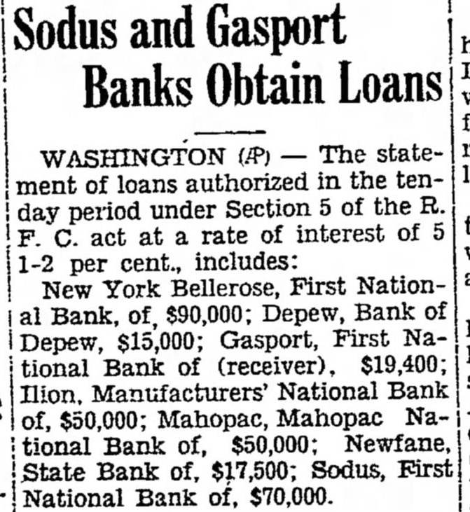 Sodus and Gasport Banks Obtain Loans The statement of loans authorized in the day period under Section of the at rate of interest of act cent., includes: per New York Bellerose, First NationBank, of, $90,000; Depew, Bank of Depew, $15,000; Gasport, First tional Bank (receiver). Manufacturers' National Bank Ilion $50,000; Mahopac, Mahopac National Bank of, Newfane, State Bank of, $17,500; Sodus, First National Bank of,
