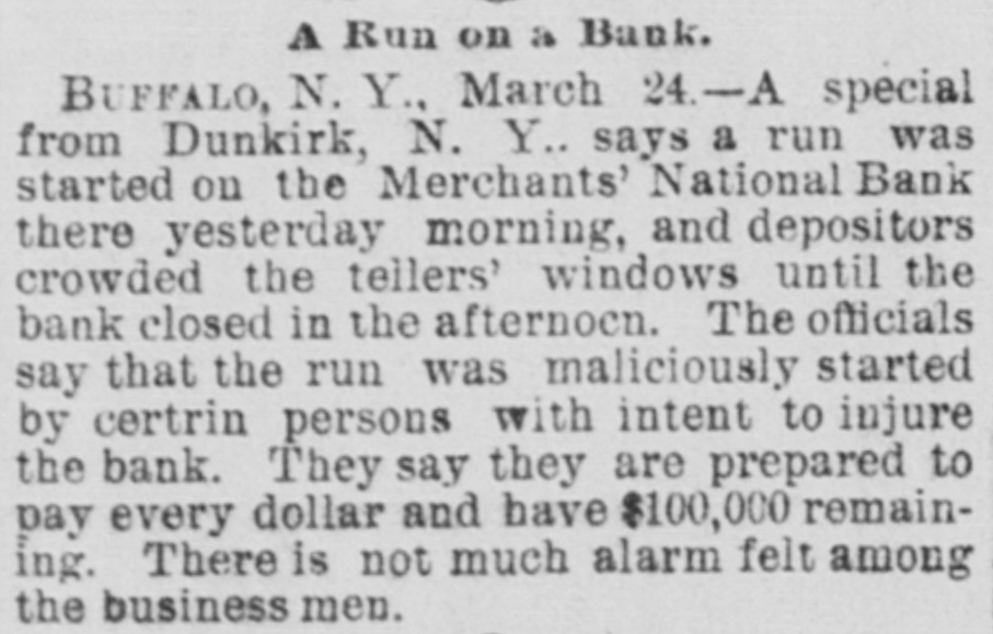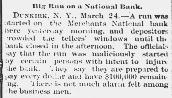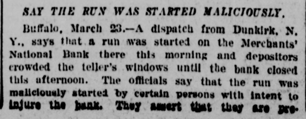 SAY THE RUN WAS STARTED MALICIOUSLY. Buffalo, March 23.-A dispatch from Dunkirk. N. Y., says that a run was started on the Merchants' National Bank there this morning and depositors crowded the teller's windows until the bank closed this afternoon. The officials say that the run was maliciously started by certain persons with intent to injure the bank. They amert timt they are pre.