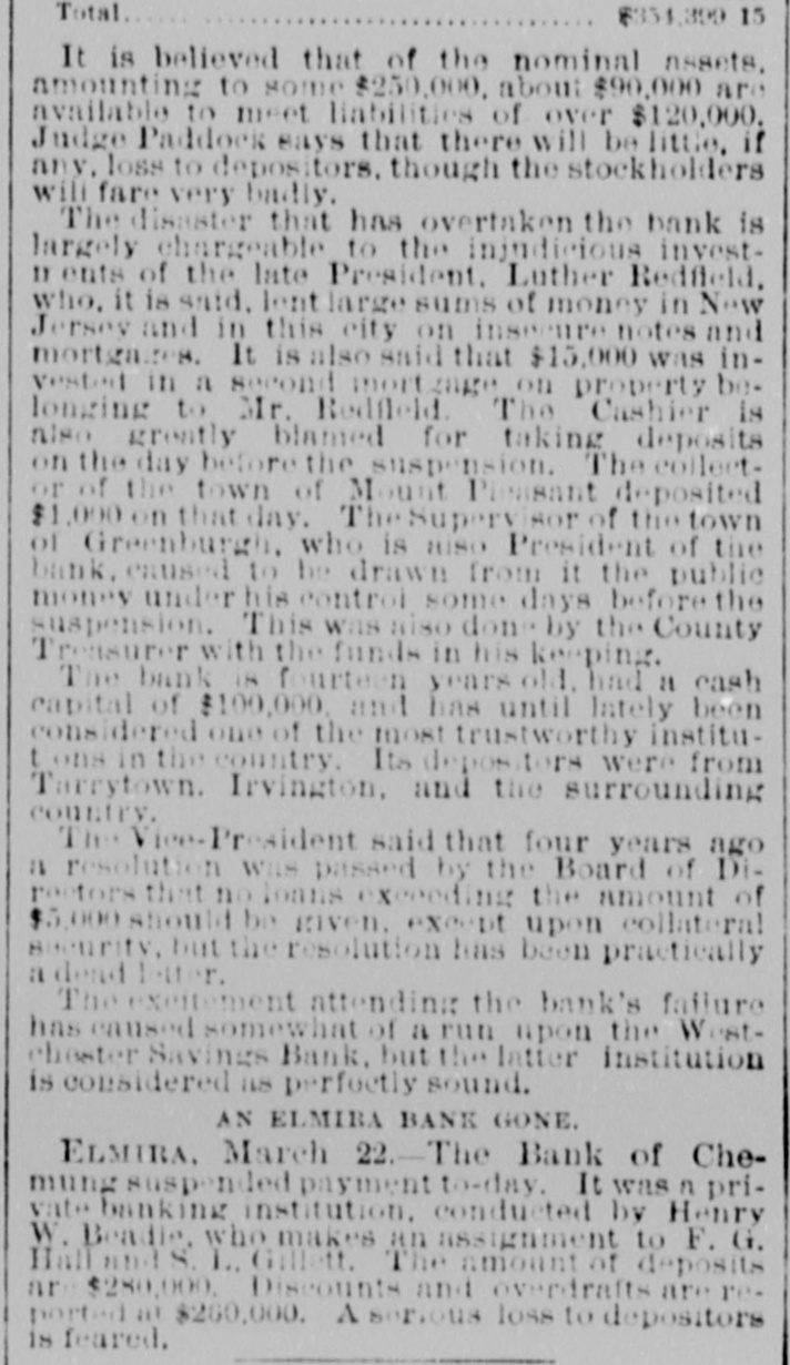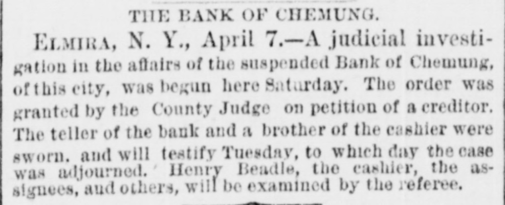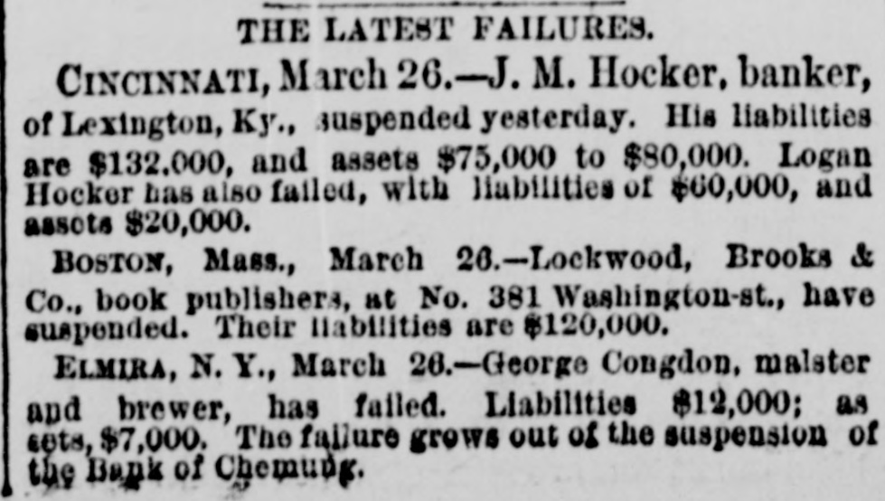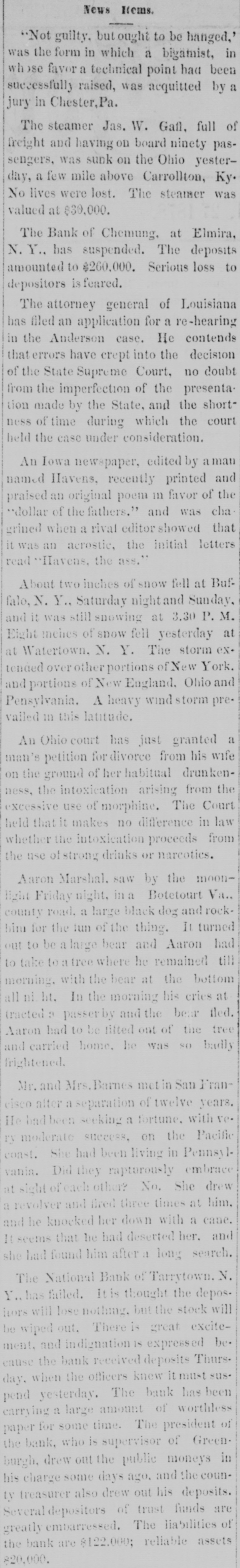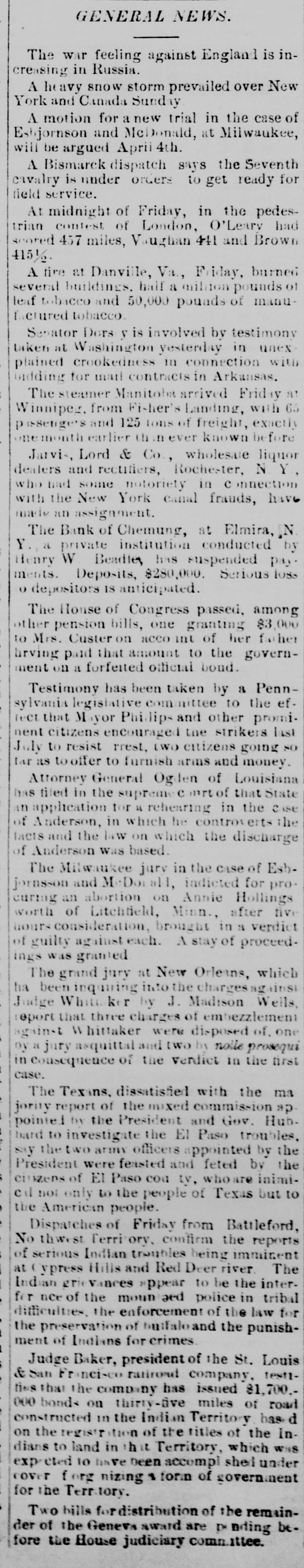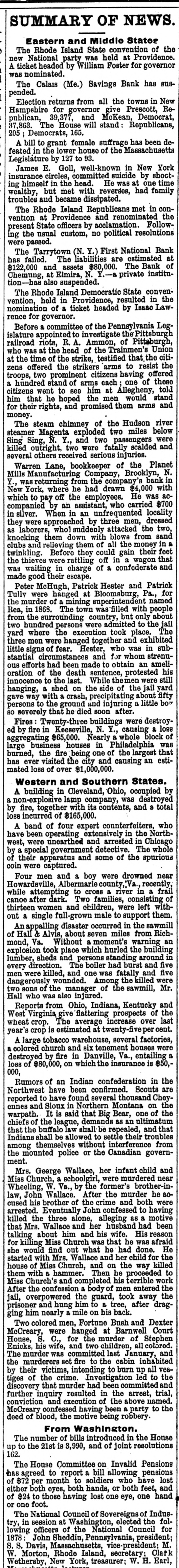 SIMEN TO Eastern and Middle States The Rhode Island State convention of the Providered 18 pieq SUM Party National MOU A ticket headed by William Foster for governor SUM -sns has Bank SEATIONS (*) Calara The pended. Election returns from all the towns in New Hampshire for governor give Prescott, Republican, 39,377, and McKean, Democrat, 87,863. The House will stand: Republicans, 205 Democrats, 165. -op useq baq essigns Female quant 07 mg V feated in the lower house of the Massachusetts 'SG 07 127 4q 1 James E. Goll, well-known in New York insurance circles, committed suicide by shocting himself in the head. He was at one time Turniy peq 4714 new int Mealth troubles and became dissipated. The Rhode Island Republicans met in convention at Providence and renominated the present State officers by acclamation. Followpoliticla ou custom's Junsu eqf Sup pessed 9.10M The Tarrytown (N. Y.) First National Bank has failed. The liabilities are estimated at $122,000 and assets $80,000. The Bank of Chemung, at Elmira, N. Y.-a private institu*pepuedsns also seq-uon The Rhode Island Democratic State convenvention, held in Providence, resulted in the -M'I 08881 sq pepson teach 8 10 rence for governor. Before a committee of the Pennsylvania Legislature appointed to investigate the Pittsburgh railroad riots, R. A. Ammon, of Pittaburgh, who was at the head of the Trainmen's Union at the time of the strike, testified that the citizens offered the strikers arms to resist the troops, two prominent citizens having offered these JO euo bach SULIE JO pusis perpuny 8 P[01 78 miq 000 07 quem clizens him that he hoped the men would stand pus SULIE them droctised pus rights their Joj money. The steam chimney of the Hudson river steamer Magenta exploded two miles below 9.19A OM7 pus "I N "Suig Said killed outright, two were fatally scalded and several others received serious injuries. Warren Lane, bookkeeper of the Planet Mills Manufacturing Company, Brooklyn, N. up hank 9,Ausdure the more SUM 4714 000'18 имар pay eq where Xork MON -08 SUM eH the до And 04 which companied by an assistant, who carried $700 in silver. When in an unfrequented locality they were approached by three men, dressed as laborers, whol suddenly attacked the two, knocking them down with blows from sand up Aeney eqf 118 JO them rellering puu squio twinkling. Before they could gain their feet the thieves were rattling off in a wagon that pus 8 JO charge up Surgery SEAL *educe. new pood epsur Peter McHugh, Patrick Hester and Patrick JOI "as 'Smqsmootg 78 pesueq 9.10.A решей Supurar 8 JO rep.mu the Rea, in 1868. The town was filled with people from the surrounding country, but only about two hundred persons were admitted to the jail yard where the execution took place. The three men were hanged together and exhibited -qus u! SUM oqu Heretor TO suSis 1itte stantial circumstances and for whom strenuous efforts had been made to obtain an amelioration of the death sentence, protested his innocence to the last. While the men were still Pard n°i the JO 00 the uo peqs 8 'SutSueq Ally quoqs Crash 8 4714 AVM GARD 20q little Suim[0] paw punois the 07 suossed 80 severely that he died soon after. Fires Twenty three buildings were destroyBBOI Sujenvo "X N up ore &q pe aggregating $65,000. Nearly whole block of large business houses in Philadelphia was 1847 the 10 euo Suieq ore the 'peu.mq UB pus atty the JOAD bag *000'000' JOAO JO 1088 mated Western and Southern States. 4q pejdnooo up Supping V SUM '{usduioo duty[ eatsoldxe-uou 8 total 8 pus 118 41141 together 'erg &q '000'9918 JO Inclured 1088 oqu 00 a mor JO pusq V have been operating extensively in the Northwest, were unearthed and arrested in Chicago by special government detective. The whole enounds the JO pus add their JO coin were captured. Jeeu реимолр 9.10A Loq 8 pus ueur FOUR Howardsville, Albermarle recently, while attempting to cross river in frail canoe after dark. Two families, consisting of thirteen women and children, were left withthem. 07 male signed 8 quo appalling disaster occurred in the sawmill Rich more miles иелея about 'SIAIV P II8H JO us s,Juemour ""A 'puour quipping our vitch PRICE took exploising ui punors statement persons pus speqs eag pus thrst pay boller eur Аледе men were killed, and one was fatally and five dangerously wounded. Among the killed were "JK the JO reSearch the JO suos om 8[8 SUM oqu II H Reports from Ohio, Indiana, Kentucky and West Virginia give flattering prospects of the wheat crop. The average increase over last central aed the 78 estimated 81 doro A large tobacco warehouse, several factories, a colored church and six tenement houses were 8 entatlique ""A up erg sq performed -'098 si 1 the vition uo '000'08$ JO 1088 '000 Rumors of an Indian confederation in the 0.10 Scoots been base Northwest reported to have found several thousand Cheyennes and Sioux in Northern Montana on the warpath. It is said that Big Bear, one of the chiefs of the league, demands as an ultimatum that the buffalo law shall be repealed, and that Indians shall be allowed to settle their troubles among themselves without interference from the mounted police or the Canadian government. Mrs. Geerge Wallace, her infant child and Miss Church, schoolgirl, were murdered near Wheeling, W. Va., by the former's brother-in-08 eq rep.mu the After Mattace. uqor "MB[ cused his brother of the crime and both were arrested. Eventually John confessed to having killed the three alone, alleging as a motive that Mrs. Wallace and her husband had been talking about him and his wife. His reason for killing Miss Church was that he was afraid she would find out what he had done. He started with Mrs. Wallace and her child for the house of Miss Church, and on the way killed them with hammer. Then he proceeded to Miss Church's and completed his terrible work After the confession a body of men entered the jail, overpowered the guard, took away the prisoner and hung him to a tree, after drag ging