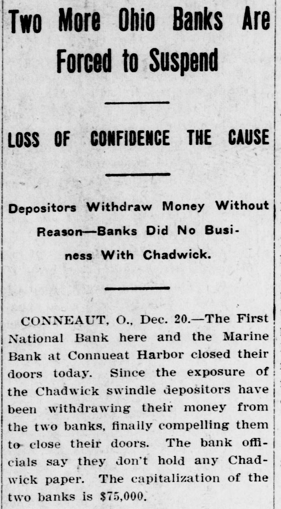seq wisen? Jun state $1 = Anthony J. Drexel's fine steam yacht, paying $650,000. The Wade Park bank, of Cleveland, O., pus of Refunides HI which jo treasurer, together with two branches, has been taken over by the Cleveland Trust company, which will conduct the business of the three institutions. W. C. Matthews, the negro football and baseball player, has been elected one of Harvard's senior class day officers. James R. Garfield, commissioner of corporations, in his first annual report, made to President Roosevelt, recommends compulsory regulation of corporations under a federal license or franchise. Admiral Sir Frasmus Ommanney, the "father of the British navy," died at Portsmouth, England, after a lengthy illness. He was the last survivor of the battle of Navarino, fought in 1827, which resulted in the destruction of the Turkfreeth us! George L. Shoup, former United States senator from Idaho, died at his home in Boise, Idaho, in his sixty-eighth year. The Metropolitan clubhouse, the home of the most fashionable club in Washington, was gutted by fire, involving an estimated loss of from $60,000 to $100,000. Mrs. William Gladden shot and killed her husband at their home at Requa gulch, south of Cripple Creek, Col. She says that he abused and beat her. The bodies of John C. Kenyon, William Lillyblade and William Emmermon have been taken from the Crocker hotel ruins in Minneapolis, Minn. Receipts of the Britt-Nelson glove contest amounted to $26,900, of which Britt received $8,877 and Nelson $5,918. The postmaster general removed two more mail carriers for interference in politics and legislation. Republican leaders conferred on the proposed railway rate bill and assured President Roosevelt congress will act during the present session. pus dn the SEM ΠΈΠΎΡΠΏΠΎΡ up traff IIV Christmas shoppers inconvenienced by a dense fog. The Illinois state board of equalization made a cut of $2,000,000 the in assessed valuation of all property in the state. City Clerk Edward M. Schuengel, of Milwaukee, Wis., aged 47 years, died suddenly. Mr. Schuengel had been suffering from Bright's disease and heart trouble for some time. After a lingering illness of three years, due to infirmities of old age, Rt. Rev. Richard Phelan, bishop of Pittsburg diocese, of the Roman Catholic church, died at Pittsburg, Pa., aged 76 years. The official report shows that during the world's fair at St. Louis the total admissions were 19,694,855, of these 12,804,616 were paid. The free admissions amounted to 6,890,239. Two trainmen were killed and one was badly scalded in a collision between freight trains on the Rochester & Pittsburg road, near West Falls, N. Y. The John Thompson & Son agricultural machine works and gasoline engine factory at Beloit, Wis., was destroyed by fire, causing a loss of $100,000. Seven were killed in the disaster at Minneapolis, Minn., when the wall of the Peck building crushed the Crocker hotel. Senator Fairbanks has decided to forward his resignation to the governor o Indiana January 9, the date of the meeting of the legislature, to take effect March 4, next, when he will be inaugurated vice president. Four men were killed and their bodies terribly mangled as the result of boiler explosion at the sawmill of B. F. Redline near Rohrsburg, Pa. James P. Eagle died at Little Rock. Ark., after an illness of three weeks. He was governor of Arkansas from 1889 to 1893. A disastrous storm which suddenly burst on the northern coast of Portugal has caused great less of life. From reports already received 37 persons have perished. President Roosevelt has accepted an invitation to deliver an address at the Lincoln day dinner to be given by the Republican club, of New York, on the February ixan jo 1334 The Minnesota board of pardons has granted a pardon to Col. Ames, brother of former Mayor Ames, of Minneapolis, and who was Mayor Ames' chief of police. concertion up graft JO contricted SUM H with the Ames administration. The First national bank, of Conneaut. O., and the Marine bank, of Conneaut Harbor, have suspended. The suspen sion resulted from runs on both concerns owing to the panie caused by the Chadwick affair. The protestants in the Smoot inquiry rested their case. The hearing was post. poned until January 10, when the defense will present evidence. Many Europeans flocking to America now are paupers and unfit for citizenship, according to Mr. Sargent, commissioner of immigration. Frederick Hall White, a Harvard football player. has taken possession of a fortune of $3,000,000 inherited from his mother. The government has adopted a stand.