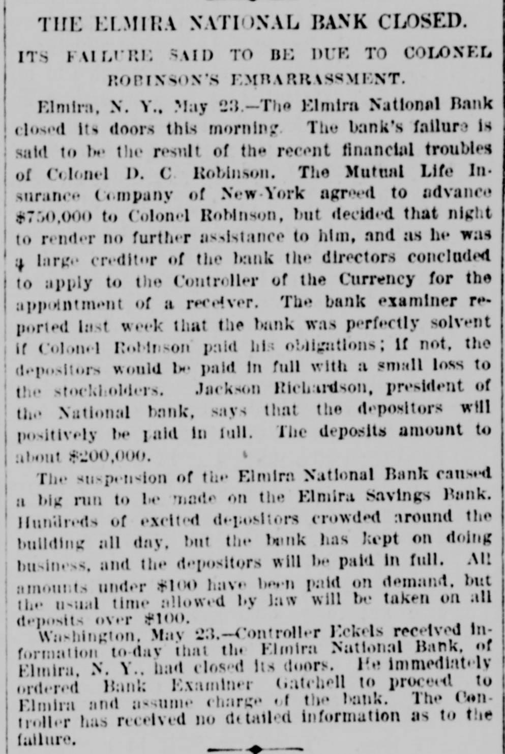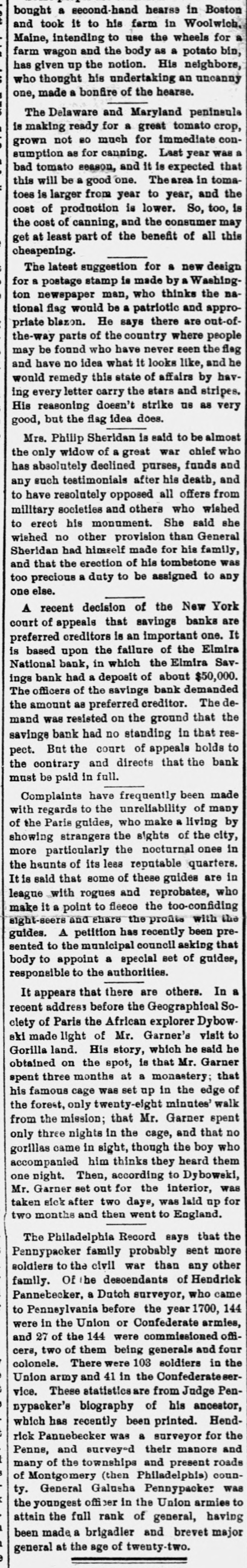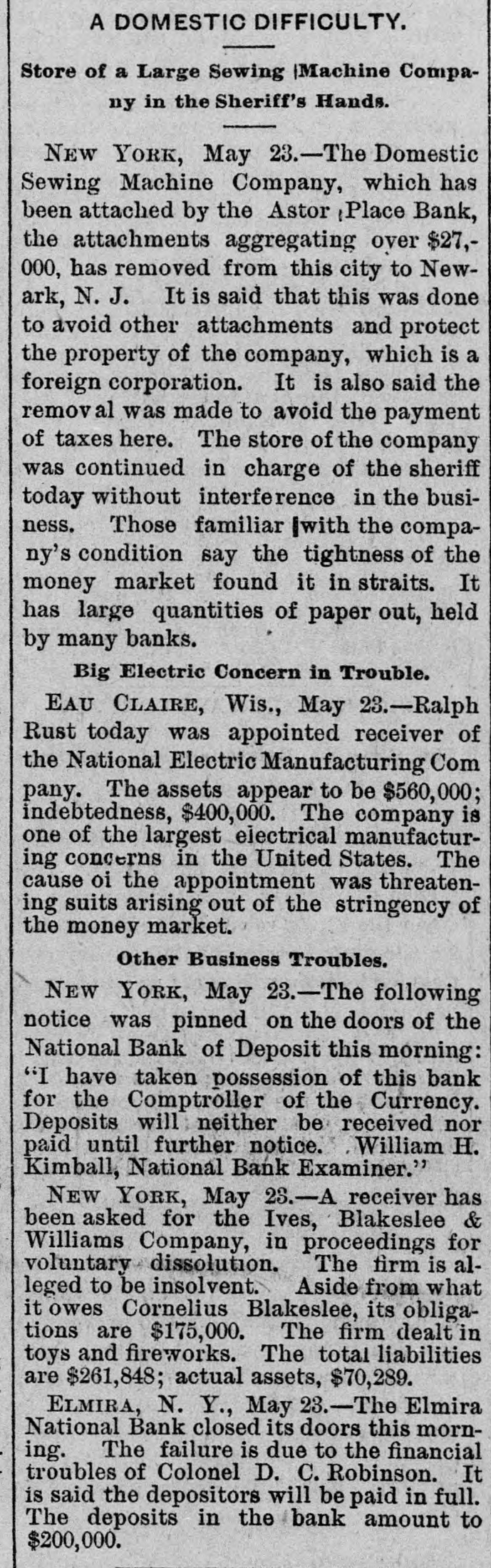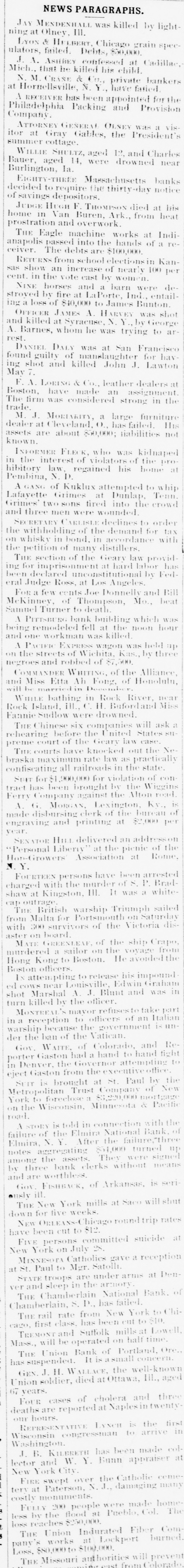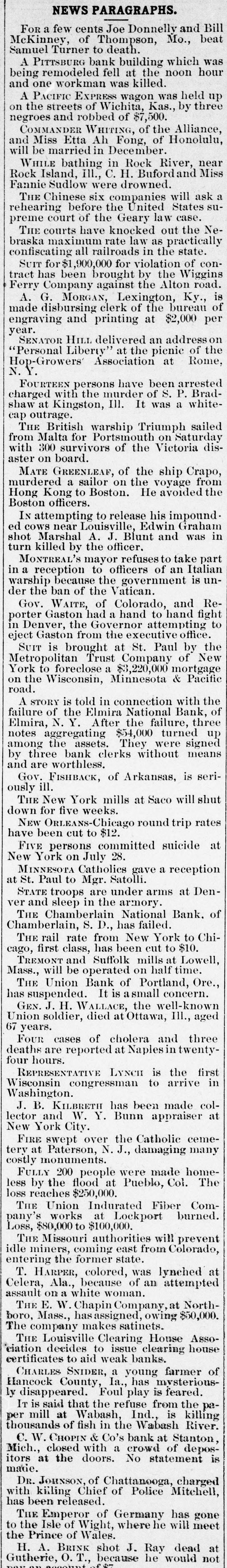 negroes and robbed of $7,500. COMMANDER WHITING, of the Alliance, and Miss Etta Ah Fong, of Honolulu, will be married in December. WHILE bathing in Rock River, near Rock Island, Ill., C. H. Bufordand Miss Fannie Sudlow were drowned. THE Chinese six companies will ask a rehearing before the United States supreme court of the Geary law case. THE courts have knocked out the Nebraska maximum rate law as practically confiscating all railroads in the state. SUIT for $1,900,000 for violation of contract has been brought by the Wiggins Ferry Company against the Alton road. A. G. MORGAN, Lexington, Ky., is made disbursing clerk of the bureau of engraving and printing at $2,000 per year. SENATOR HILL delivered an addresson "Personal Liberty" at the pienic of the Hop-Growers' Association at Rome, N.Y. FOURTEEN persons have been arrested charged with the murder of S. P. Bradshaw at Kingston, III. It was a whitecap outrage. THE British warship Triumph sailed from Malta for Portsmouth on Saturday with 300 survivors of the Victoria disaster on board. MATE GREENLEAF, of the ship Crapo, murdered a sailor on the voyage from Hong Kong to Boston. He avoided the Boston officers. IN attempting to release his impounded cows near Louisville, Edwin Graham shot Marshal A. J. Blunt and was in turn killed by the officer. MONTREAL'S mayor refuses to take part in a reception to officers of an Italian warship because the government is under the ban of the Vatican. Gov. WAITE, of Colorado, and Reporter Gaston had a hand to hand fight in Denver, the Governor attempting to eject Gaston from the executive office. SUIT is brought at St. Paul by the Metropolitan Trust Company of New York to foreclose a $3,220,000 mortgage on the Wisconsin, Minnesota & Pacific road. A STORY is told in connection with the failure of the Elmira National Bank, of Elmira, N. Y. After the failure, three notes aggregating $54,000 turned up among the assets. They were signed by three bank clerks without means and are worthless. Gov. FISHBACK, of Arkansas, is seriously ill. THE New York mills at Saco will shut down for five weeks. NEW ORLEANS-Chicago round trip rates have been cut to $12. FIVE persons committed suicide at New York on July 28. MINNESOTA Catholics gave a reception at St. Paul to Mgr. Satolli. STATE troops are under arms at Denver and sleep in the armory. THE Chamberlain National Bank. of Chamberlain, S. D., has failed. THE rail rate from New York to Chicago, first class, has been cut to $10. TREMONT and Suffolk mills at Lowell, Mass., will be operated on half time. THE Union Bank of Portland, Ore., has suspended. It is asmall concern. GEN. J. H. WALLACE, the well-known Union soldier, died at Ottawa, III., aged 67 years. FOUR cases of cholera and three deaths are reported at Naples in twentyfour hours. REPRESENTATIVE LYNCH is the first Wisconsin congressman to arrive in Washington. J. B. KILBRETH has been made collector and W. Y. Bunn appraiser at New York City. FIRE swept over the Catholic cemetery at Paterson, N. J., damaging many costly monuments. FULLY 200 people were made homeless by the flood at Pueblo, Col. The loss reaches $250,000. THE Union Indurated Fiber Company's works at Lockport burned. Loss, $80,000 to $100,000. THE Missouri authorities will prevent idle miners, coming east from Colorado, entering the former state. T. HARPER, colored, was lynched at Celera, Ala., because of an attempted assault on a white woman. THE E. W. Chapin Company, at Northboro, Mass., has assigned, owing $50,000. The company makes satinets. THE Louisville Clearing House Association decides to issue clearing house certificates to aid weak banks. CHARLES SNIDER, a young farmer of Hancock County, Ia., has mysteriously disappeared. Foul play is feared. IT is said that the refuse from the paper mill at Wabash, Ind., is killing thousands of fish in the Wabash River. C. W. CHOPIN & Co's bank at Stanton, Mich., closed with a crowd of depositors at the doors. No statement is made. DR. JOHNSON, of Chattanooga, charged with killing Chief of Police Mitchell, has been released. THE Emperor of Germany has gone to the Isle of Wight, where he will meet the Prince of Wales. H. A. BRINK shot J. Ray dead at Gutherie, O.T., because he would not
