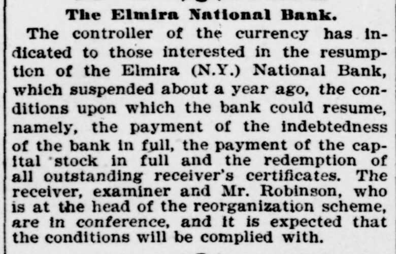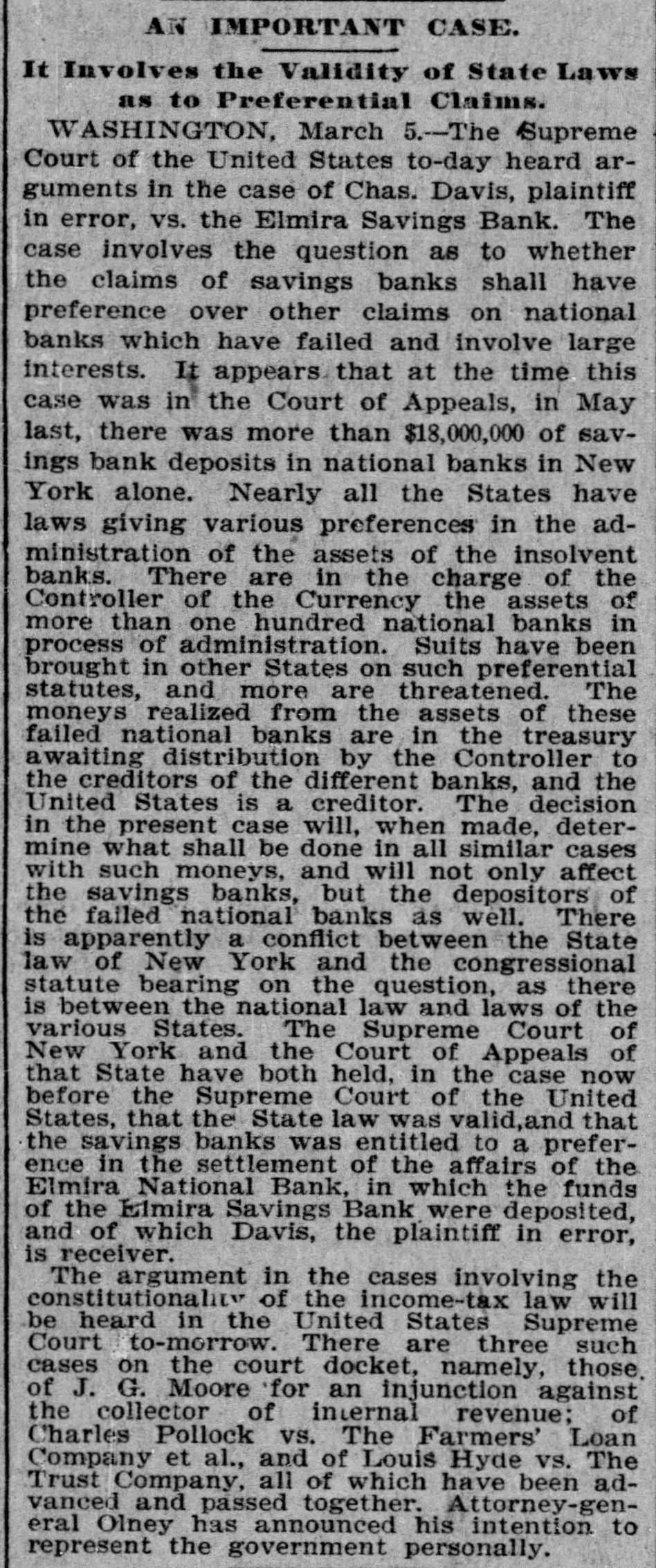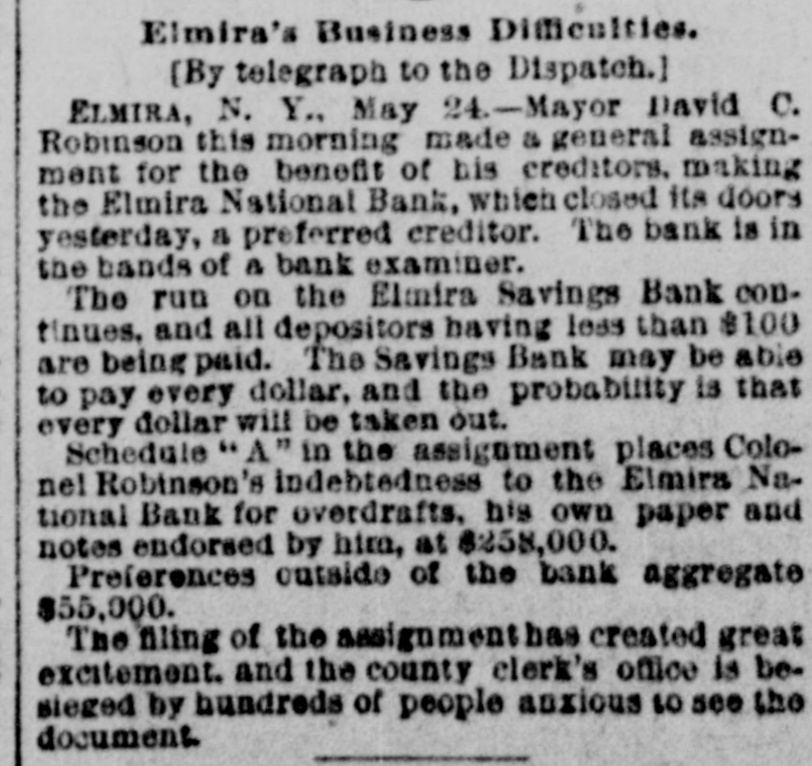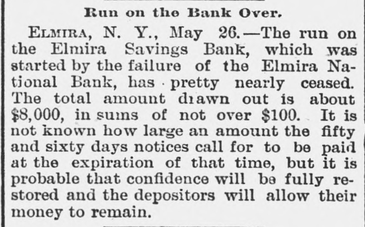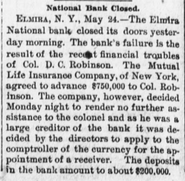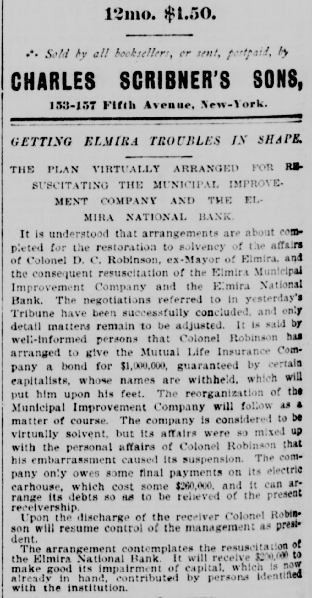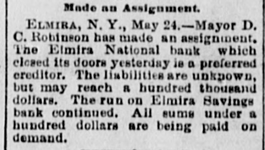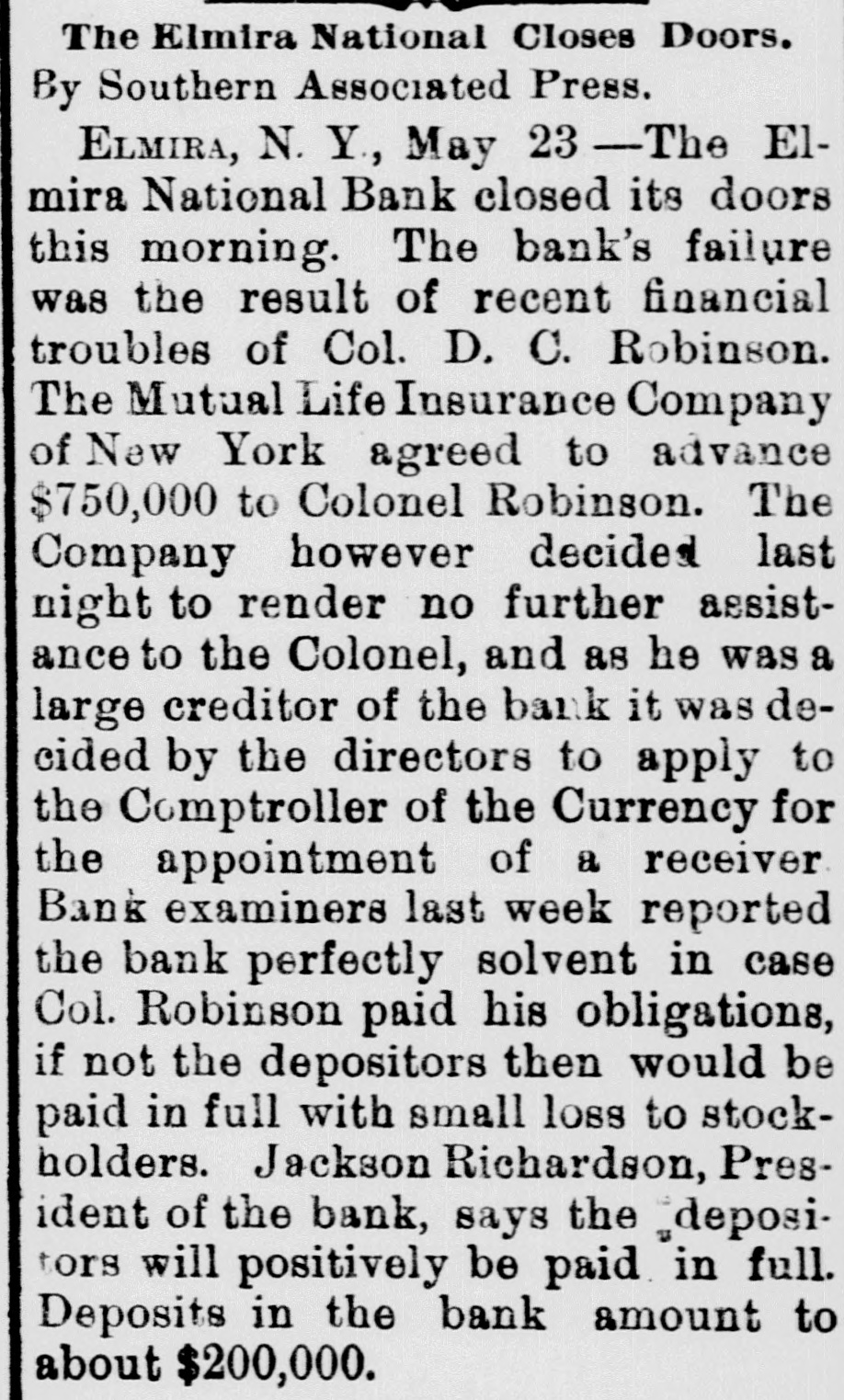 negroes and robbed of $7,500. COMMANDER WHITING, of the Alliance, and Miss Etta Ah Fong, of Honolulu, will be married in December. WHILE bathing in Rock River, near Rock Island, Ill., C. H. Bufordand Miss Fannie Sudlow were drowned. THE Chinese six companies will ask a rehearing before the United States supreme court of the Geary law case. THE courts have knocked out the Nebraska maximum rate law as practically confiscating all railroads in the state. SUIT for $1,900,000 for violation of contract has been brought by the Wiggins Ferry Company against the Alton road. A. G. MORGAN, Lexington, Ky., is made disbursing clerk of the bureau of engraving and printing at $2,000 per year. SENATOR HILL delivered an addresson "Personal Liberty" at the pienic of the Hop-Growers' Association at Rome, N.Y. FOURTEEN persons have been arrested charged with the murder of S. P. Bradshaw at Kingston, III. It was a whitecap outrage. THE British warship Triumph sailed from Malta for Portsmouth on Saturday with 300 survivors of the Victoria disaster on board. MATE GREENLEAF, of the ship Crapo, murdered a sailor on the voyage from Hong Kong to Boston. He avoided the Boston officers. IN attempting to release his impounded cows near Louisville, Edwin Graham shot Marshal A. J. Blunt and was in turn killed by the officer. MONTREAL'S mayor refuses to take part in a reception to officers of an Italian warship because the government is under the ban of the Vatican. Gov. WAITE, of Colorado, and Reporter Gaston had a hand to hand fight in Denver, the Governor attempting to eject Gaston from the executive office. SUIT is brought at St. Paul by the Metropolitan Trust Company of New York to foreclose a $3,220,000 mortgage on the Wisconsin, Minnesota & Pacific road. A STORY is told in connection with the failure of the Elmira National Bank, of Elmira, N. Y. After the failure, three notes aggregating $54,000 turned up among the assets. They were signed by three bank clerks without means and are worthless. Gov. FISHBACK, of Arkansas, is seriously ill. THE New York mills at Saco will shut down for five weeks. NEW ORLEANS-Chicago round trip rates have been cut to $12. FIVE persons committed suicide at New York on July 28. MINNESOTA Catholics gave a reception at St. Paul to Mgr. Satolli. STATE troops are under arms at Denver and sleep in the armory. THE Chamberlain National Bank. of Chamberlain, S. D., has failed. THE rail rate from New York to Chicago, first class, has been cut to $10. TREMONT and Suffolk mills at Lowell, Mass., will be operated on half time. THE Union Bank of Portland, Ore., has suspended. It is asmall concern. GEN. J. H. WALLACE, the well-known Union soldier, died at Ottawa, III., aged 67 years. FOUR cases of cholera and three deaths are reported at Naples in twentyfour hours. REPRESENTATIVE LYNCH is the first Wisconsin congressman to arrive in Washington. J. B. KILBRETH has been made collector and W. Y. Bunn appraiser at New York City. FIRE swept over the Catholic cemetery at Paterson, N. J., damaging many costly monuments. FULLY 200 people were made homeless by the flood at Pueblo, Col. The loss reaches $250,000. THE Union Indurated Fiber Company's works at Lockport burned. Loss, $80,000 to $100,000. THE Missouri authorities will prevent idle miners, coming east from Colorado, entering the former state. T. HARPER, colored, was lynched at Celera, Ala., because of an attempted assault on a white woman. THE E. W. Chapin Company, at Northboro, Mass., has assigned, owing $50,000. The company makes satinets. THE Louisville Clearing House Association decides to issue clearing house certificates to aid weak banks. CHARLES SNIDER, a young farmer of Hancock County, Ia., has mysteriously disappeared. Foul play is feared. IT is said that the refuse from the paper mill at Wabash, Ind., is killing thousands of fish in the Wabash River. C. W. CHOPIN & Co's bank at Stanton, Mich., closed with a crowd of depositors at the doors. No statement is made. DR. JOHNSON, of Chattanooga, charged with killing Chief of Police Mitchell, has been released. THE Emperor of Germany has gone to the Isle of Wight, where he will meet the Prince of Wales. H. A. BRINK shot J. Ray dead at Gutherie, O.T., because he would not