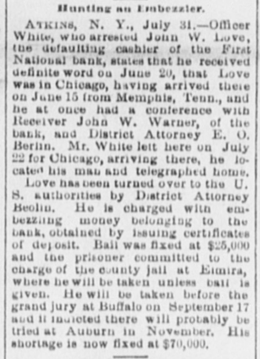 Hunting .... Embezzier. ATKINS, N. Y., July 31.-Officer White, who arrested John W. Love, the defaulting cashier of the First National bank, states that he received definite word on June 20, that Love was in Chicago, having arrived there on June 15 from Memphis, Tenn., and he at once had a conference with Receiver John W. Warner, of the bank, and District Attorney E. O. Berlin. Mr. White leit here on July 22 for Chicago, arriving there, he 10cated his man and telegraphed home. Love has been turned over to the U. S. authorities by District Attorney Beolin. He is charged with embezzing money belonging to the bank, obtained by issuing certificates of deposit. Ball W&B fixed at $25,000 and the prisoner committed to the charge of the county jail at Eimira, where he will be taken unless ball is given. He will be taken before the grand jury at Buffalo on September 17 and 11 indicted there will probably be tried at Auburn in November. His shortage is now fixed at $70,000.
