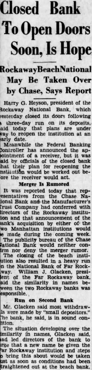 Closed Bank Doors Soon, Is Hope May Be Taken Over by Chase, Says Report Harry Heyson, president of the National Bank, which closed its doors following three-day its deposits, today that plans under reopen the institution at an date. Meanwhile the Federal Banking Controller has announced the appointment receiver, but by officials of the closed bank plan for reopening the would worked out bethe receiver would act. Merger Is Rumored was reported today that esentatives from Chase Bank and the Manufacturer's Company had conferred with lirectors of the Rockaway instituand that of the acquisition by either the Manhattan institutions would during the week. The bureau of the Chase would neither conthe rumor. The closing the beach instialso resulted heavy run the National Bank Far RockWilliam Glacken, presiof the Far Rockaway bank, the in names bethe two Rockaway banks was esponsible. Run on Second Bank Mr. Glacken said most withdrawwere made by "small depositors." bank, he said, in sound conThe situation developing over the imilarity names, Glacken said, led directors of the bank that new name be given the Rockaway institution steps bring this about would be taken conditions had been traightened out at the beach bank.