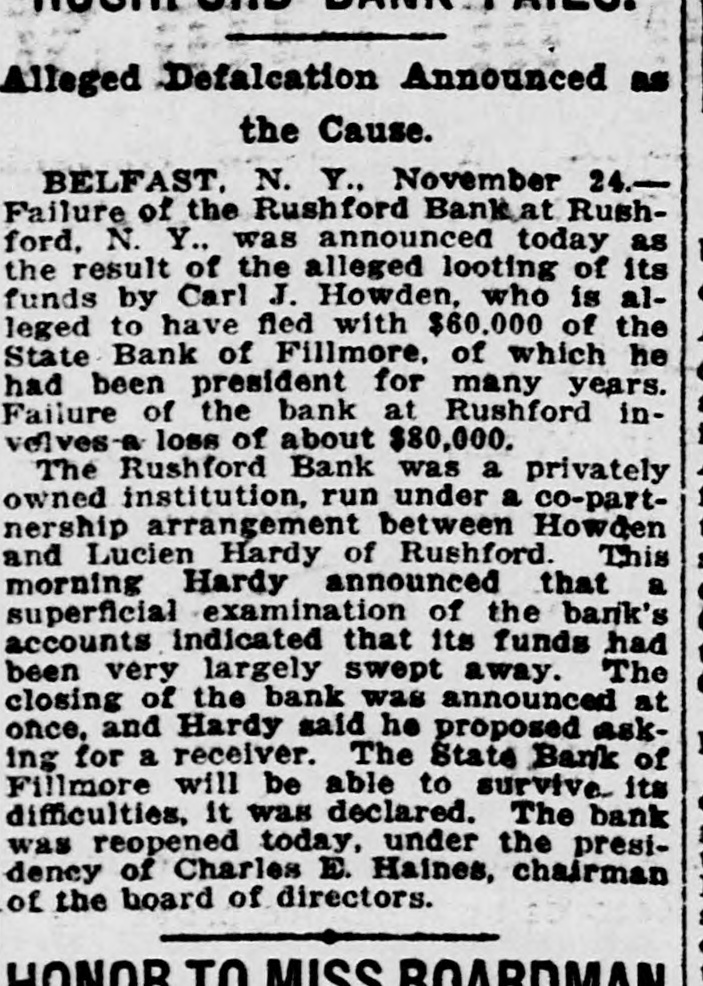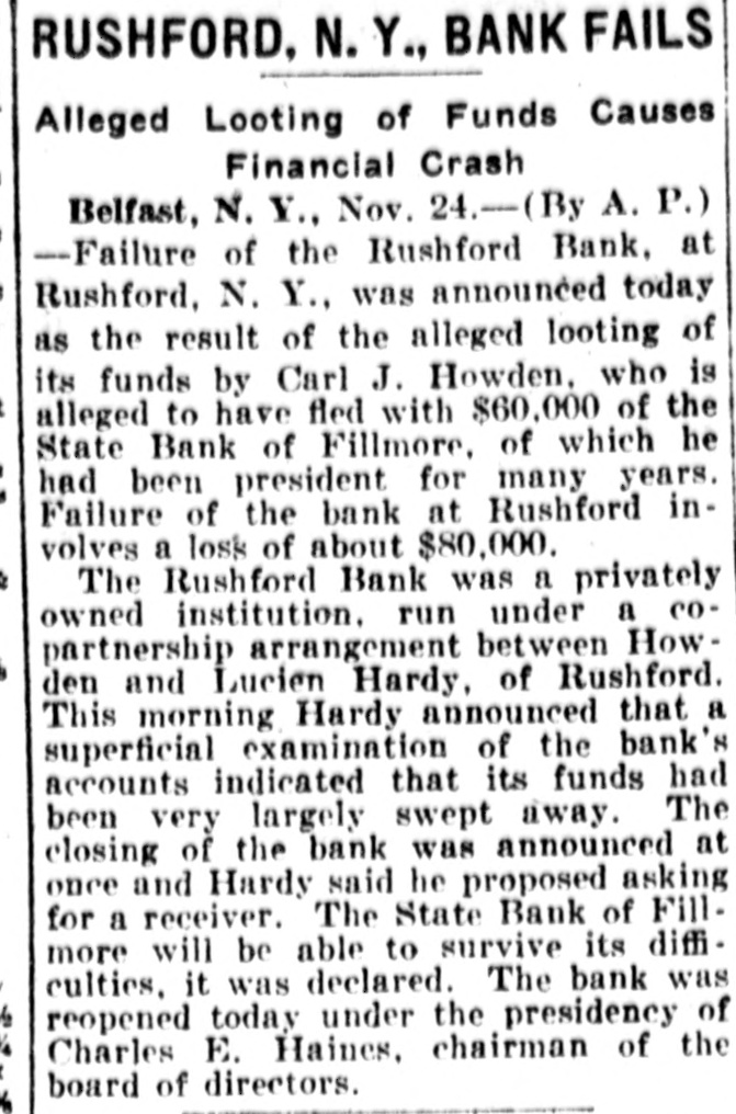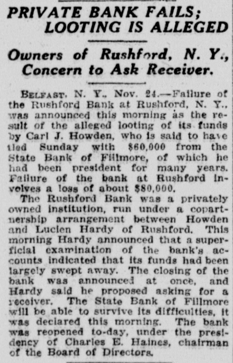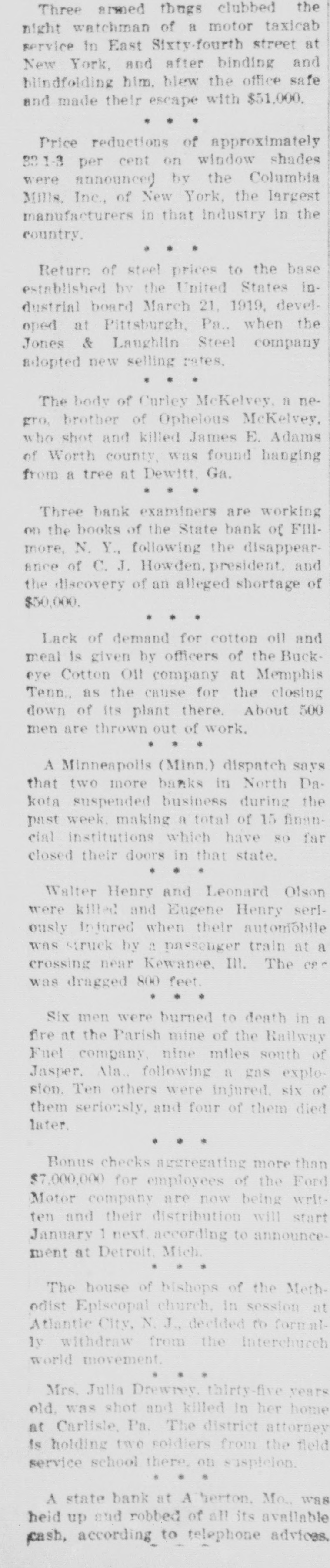 Three armed thugs clubbed the night watchman of a motor taxicab service In East Sixty-fourth street at New York, and after binding and blindfolding him. blew the office safe and made their escape with $51,000. Price reductions of approximately 83 1-3 per cent on window shades were announced by the Columbia Mills. Inc., of New York, the largest manufacturers in that industry in the country. Return of steel prices to the base established by the United States industrial board March 21, 1919, developed at Pittsburgh, Pa., when the Jones & Laughlin Steel company adopted new selling rates, The body of Curley McKelvey, a negro, brother of Ophelous McKelvey, who shot and killed James E. Adams of Worth county, was found hanging from a tree at Dewitt, Ga. Three bank examiners are working on the books of the State bank of Fillmore, N. Y., following the disappearance of C. J. Howden, president, and the discovery of an alleged shortage of $50,000. Lack of demand for cotton oil and meal is given by officers of the Buckeye Cotton on company at Memphis Tenn., as the cause for the closing down of its plant there. About 500 men are thrown out of work. A Minneapolis (Minn.) dispatch says that two more banks in North Dakota suspended business during the past week. making a total of 15 financial institutions which have so far closed their doors in that state. Walter Henry and Leonard Olson were killed and Eugene Henry seriously injured when their automobile was struck by a passenger train at a crossing near Kewanee, III. The CP * was dragged 800 feet. Six men were burned to death in a fire at the Parish mine of the Railway Fuel company, nine miles south of Jasper. Ala., following a gas explosion. Ten others were injured. six of them seriously, and four of them died later. Bonus checks aggregating more than $7,000,000 for employees of the Ford Motor company are now being write ten and their distribution will start January 1 next according to announcement at Detroit. Mich. The house of bishops of the Methedist Episcopal church, in session at Atlantic City, N. J., decided to formally withdraw from the Interchurch world movement. Mrs. Julia Drewrey thirty-five years old. was shot and killed in her home at Carlisle. Pa. The district attorney is holding two soldiers from the field service school there. on suspicion. A state bank at A herton. Mo., was held up and robbed of all its available cash, according to telephone advices.