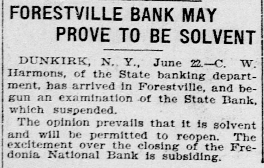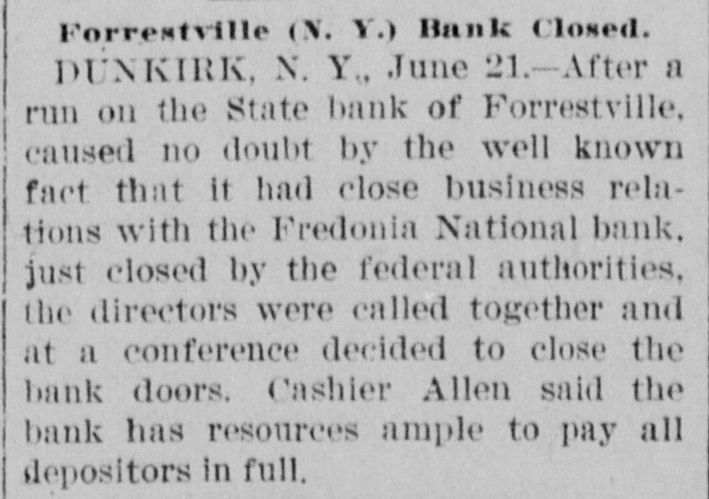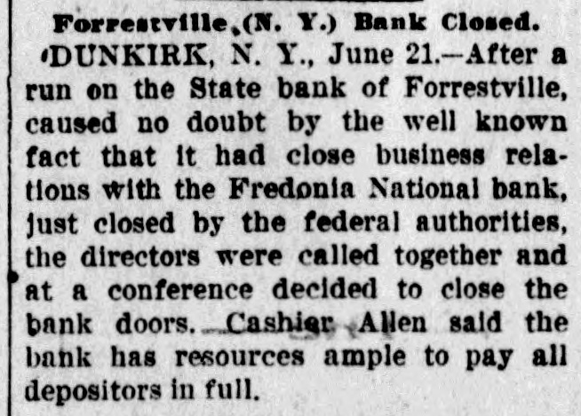 Forrestville, (N. Y.) Bank Closed. DUNKIRK, N. Y., June 21.-After a run on the State bank of Forrestville, caused no doubt by the well known fact that It had close business relations with the Fredonia National bank, just closed by the federal authorities, the directors were called together and at a conference decided to close the bank doors. Cashier Allen said the bank has resources ample to pay all depositors in full.
