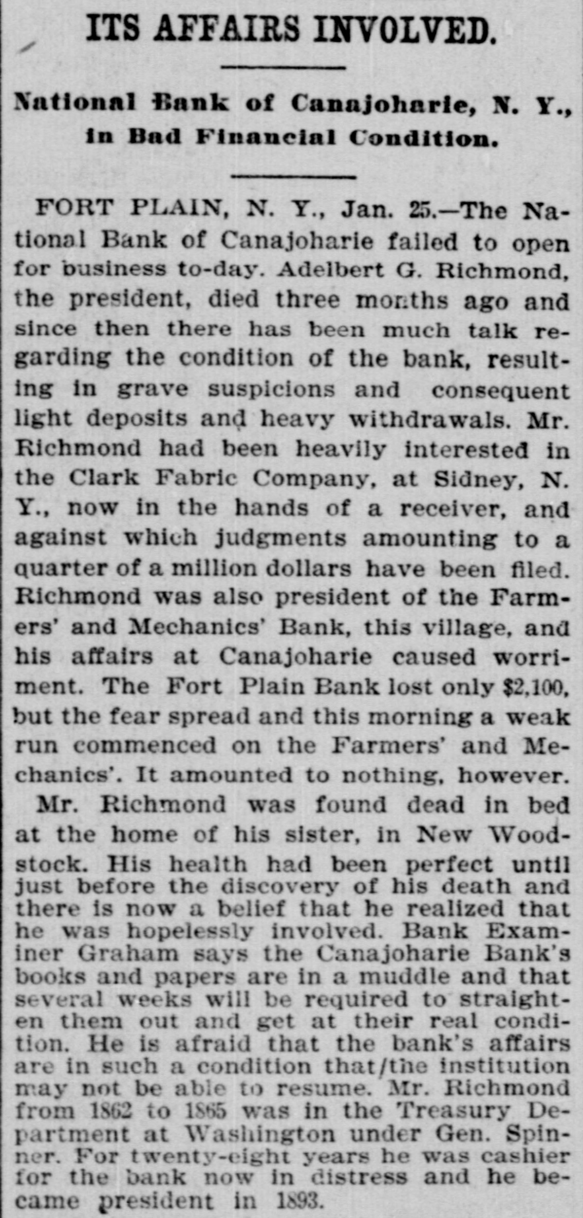 ITS AFFAIRS INVOLVED. National Bank of Canajoharie, N. Y., in Bad Financial Condition. FORT PLAIN, N. Y., Jan. 25.-The National Bank of Canajoharie failed to open for business to-day. Adelbert G. Richmond, the president, died three months ago and since then there has been much talk regarding the condition of the bank, resulting in grave suspicions and consequent light deposits and heavy withdrawals. Mr. Richmond had been heavily interested in the Clark Fabric Company, at Sidney, N. Y., now in the hands of a receiver, and against which judgments amounting to a quarter of a million dollars have been filed. Richmond was also president of the Farmers' and Mechanics' Bank, this village, and his affairs at Canajoharie caused worriment. The Fort Plain Bank lost only $2,100, but the fear spread and this morning a weak run commenced on the Farmers' and Mechanics'. It amounted to nothing, however. Mr. Richmond was found dead in bed at the home of his sister, in New Woodstock. His health had been perfect until just before the discovery of his death and there is now a belief that he realized that he was hopelessly involved. Bank Examiner Graham says the Canajoharie Bank's books and papers are in a muddle and that several weeks will be required to straighten them out and get at their real condition. He is afraid that the bank's affairs are in such a condition that/the institution may not be able to resume. Mr. Richmond from 1862 to 1865 was in the Treasury Department at Washington under Gen. Spinner. For twenty-eight years he was cashier for the bank now in distress and he became president in 1893.