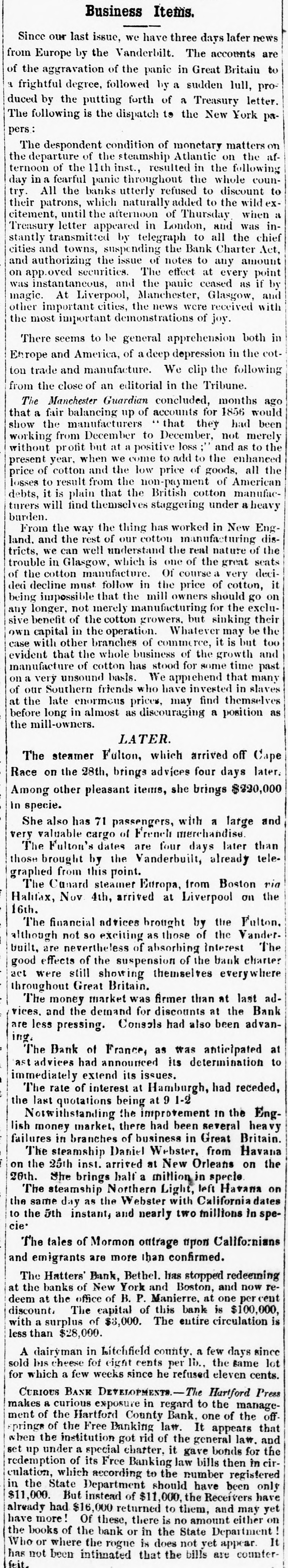 Business Items. Since our last issue, we have three days lafer news from Europe by the Vanderbilt. The accounts are of the aggravation of the panic in Great Britain to a frightful degree, followed by a sudden lull, produced by the putting forth of a Treasury letter. The following is the dispatch to the New York papers: The despondent condition of monetary matters on the departure of the steamship Atlantic on the afternoon of the 11th inst., resulted in the following day in a fearful panic throughout the whole country. All the banks utterly refused to discount to their patrons, which naturally added to the wild excitement, until the afternoon of Thursday when a Treasury letter appeared in London, and was instantly transmitted by telegraph to all the chief cities and towns, suspending the Bank Charter Act, and authorizing the issue of notes to any amount on app.oved securities. The effect at every point was instantaneous, and the panic ceased as if by magic. At Liverpool, Manchester, Glasgow, and other important cities, the news were received with the most important demonstrations of joy. There seems to be general apprehension both in Ehrope and America, of a deep depression in the cotton trade and manufacture. We clip the following from the close of an editorial in the Tribune. The Manchester Guardian concluded, months ago that a fair balancing up of accounts for 1856 would show the manufacturers that they had been working from December to December, not merely without profit but at a positive loss and as to the present year, when we come to add to the enhanced price of cotton and the low price of goods, all the losses to result from the non-payment of American debts, it is plain that the British cotton manufacturers will find themselves staggering under a heavy burden. From the way the thing has worked in New England. and the rest of our cotton manufacturing districts, we can well understand the real nature of the trouble in Glasgow, which is one of the great seats of the cotton manufacture. Of course a very decided decline must follow in the price of cotton, it being impossible that the mill owners should go on any longer, not merely manufacturing for the exclusive benefit of the cotton growers, but sinking their own capital in the operation. Whatever may be the case with other branches of commerce, it is but too evident that the whole business of the growth and manufacture of cotton has stood for some time past on a very unsound basis. We appiehend that many of our Southern friends who have invested in slaves at the late enormous prices, may find themselves before long in almost as discouraging a position as the mill-owners. LATER. The steamer Fulton, which arrived off Cape Race on the 28th, brings advices four days later. Among other pleasant items, she brings $230,000 in specie. She also has 71 passengers, with a large and very valuable cargo of French merchandise. The Fulton's dates are four days later than those brought by the Vanderbuilt, already telegraphed from this point. The Cunard steamer Europa, from Boston via Halitax, Nov 4th, arrived at Liverpool on the 16th. The financial advices brought by the Fulton. although not so exciting as those of the Vanderbuilt, are nevertheless of absorbing Interest The good effects of the suspension of the bank charter act were still showing themselves everywhere throughout Great Britain. The money market was firmer than at last advices. and the demand for discounts at the Bank are less pressing. Consols had also been advaning. The Bank of France, as was anticipated at ast advices had announced its determination to immediately extend its issues. The rate of interest at Hamburgh, had receded, the last quotations being at 9 1-2 Notwithstanding the improvement in the English money market, there had been several heavy failures in branches of business in Great Britain. The steamship Daniel Webster, from Havana on the 25th inst. arrived at New Orleans on the 20th. She brings half a million in specie The steamship Northern Light, left Havana on the same day as the Webster with California dates to the 5th instant, and nearly two millions in specie' The tales of Mormon ontrage upon Californians and emigrants are more than confirmed. The Hatters' Bank, Bethel. has stopped redeeming at the banks of New York and Boston, and now redeem at the office of B. P. Manierre. at one cent discount. The capital of this bank is $100,000, with a surplus of $3,000. The entire circulation is less than $28,000. A dairyman in Litchfield county. a few days since sold his cheese fot eight cents per lb., the same lot for which a few weeks since he refused eleven cents. CURIOUS BANK DEVELOPMENTS.-The Hartford Press makes a curious exposure in regard to the management of the Hartford County Bank, one of the offsprings of the Free Banking law. It appears that when the institution got rid of the general law. and set up under a special charter, it gave bonds for the redemption of its Free Banking law bills then in circulation, which according to the number registered in the State Department should have been only $11,000. But instead of $11,000, the Receivers have already had $16,000 returned to them, and may yet have more! Of these, there is no amount either on the books of the bank. in the State, Department