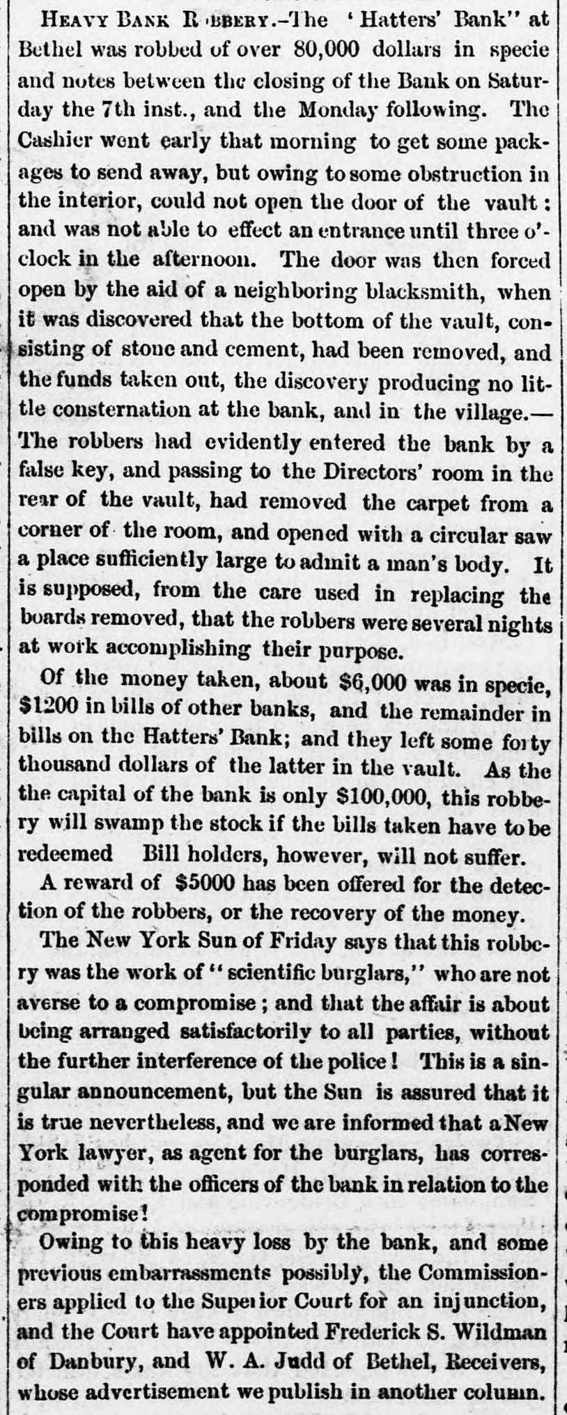 HEAVY BANK Robbery.-The 'Hatters' Bank" at Bethel was robbed of over 80,000 dollars in specie and notes between the closing of the Bank on Saturday the 7th inst., and the Monday following. The Cashier went early that morning to get some packages to send away, but owing to some obstruction in the interior, could not open the door of the vault: and was not able to effect an entrance until three o'clock in the afternoon. The door was then forced open by the aid of a neighboring blacksmith, when it was discovered that the bottom of the vault, consisting of stone and cement, had been removed, and the funds taken out, the discovery producing no little consternation at the bank, and in the village.The robbers had evidently entered the bank by a false key, and passing to the Directors' room in the rear of the vault, had removed the carpet from a corner of the room, and opened with a circular saw a place sufficiently large to admit a man's body. It is supposed, from the care used in replacing the boards removed, that the robbers were several nights at work accomplishing their purpose. Of the money taken, about $6,000 was in specie, $1200 in bills of other banks, and the remainder in bills on the Hatters' Bank; and they left some forty thousand dollars of the latter in the vault. As the the capital of the bank is only $100,000, this robbery will swamp the stock if the bills taken have to be redeemed Bill holders, however, will not suffer. A reward of $5000 has been offered for the detection of the robbers, or the recovery of the money. The New York Sun of Friday says that this robbery was the work of 'scientific burglars," who are not averse to a compromise; and that the affair is about being arranged satisfactorily to all parties, without the further interference of the police ! This is a singular announcement, but the Sun is assured that it is true nevertheless, and we are informed that a New York lawyer, as agent for the burglars, has corresponded with the officers of the bank in relation to the compromise! Owing to this heavy loss by the bank, and some previous embarrassments possibly, the Commissioners applied to the Superior Court for an injunction, and the Court have appointed Frederick S. Wildman of Danbury, and W. A. Judd of Bethel, Receivers, whose advertisement we publish in another columin.