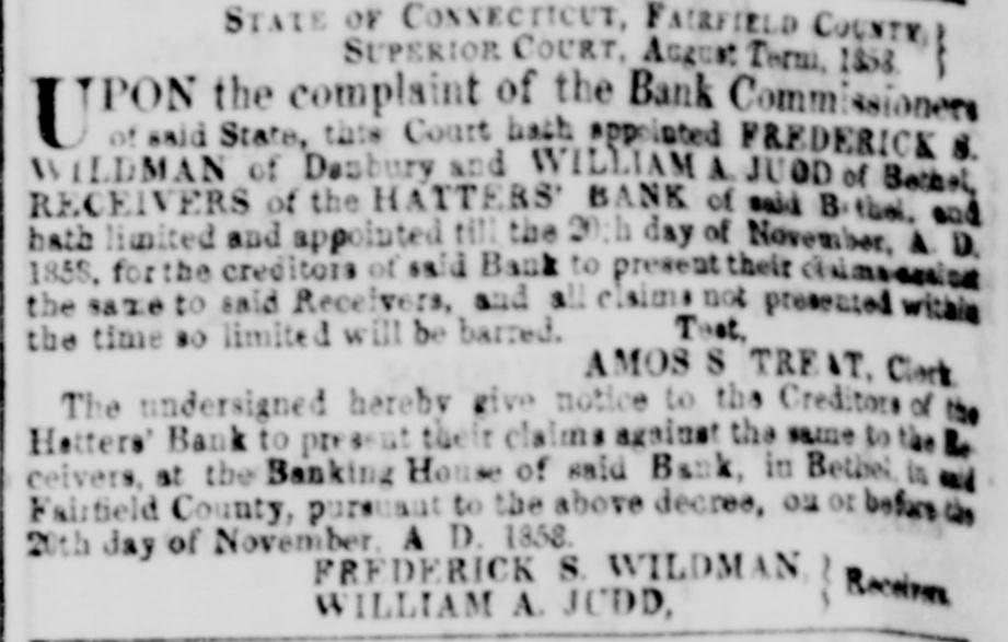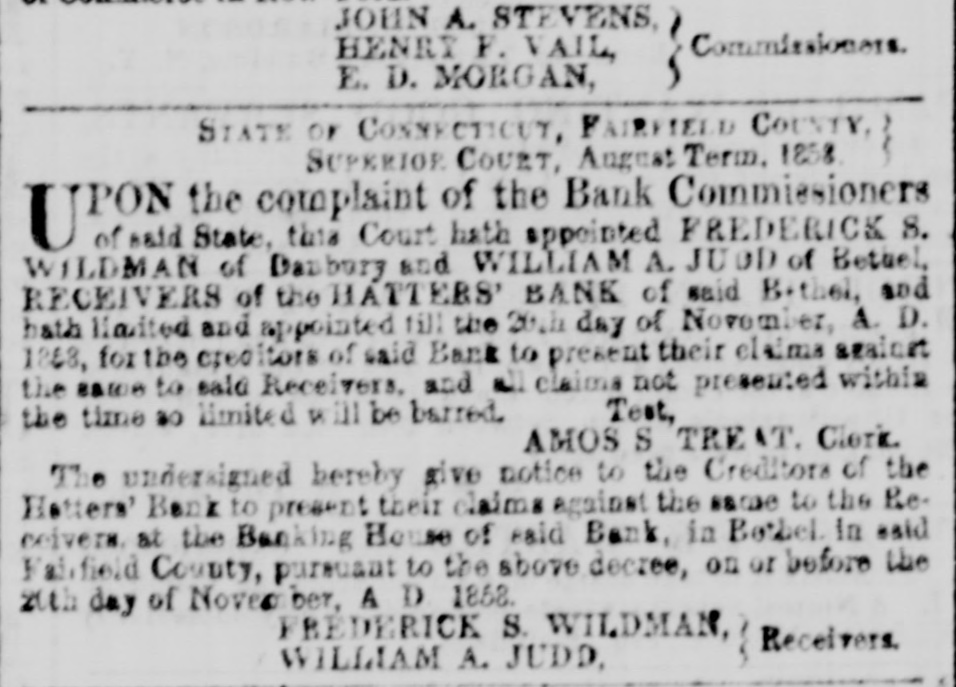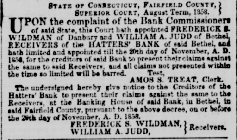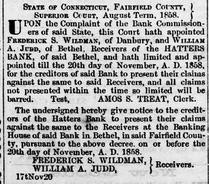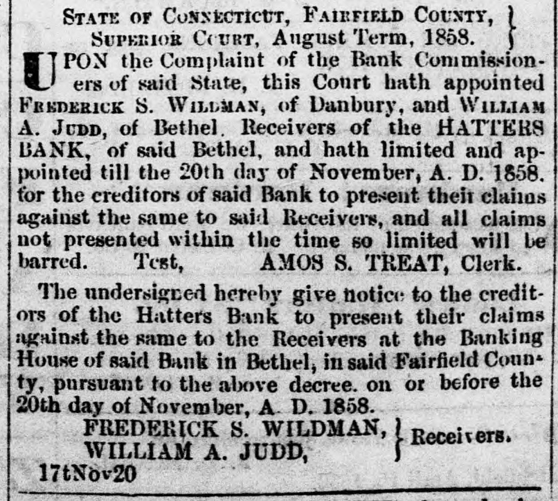 This Court hath appointed FREDERICK S. WILDMAN, of Danbury, and WILLIAM A. JUDD, of Bethel, Receivers of the HATTERS' BANK of said Bethel, and hath limited and appointed till the 20th day of November, A. D. 1858, for the creditors of said Bank to present their claims...