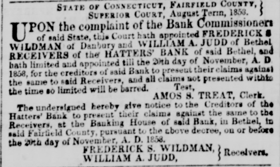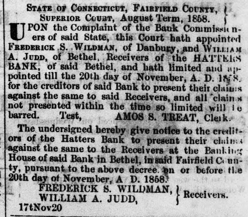 STATE OF CONNECTICUT, FAIRFIELD COUNTY, SUPERIOR COURT, August Term, 1858. UPON the complaint of the Bank Commissioners of said State, this Court hath appointed FREDERICK s. WILDMAN of Danbury and WILLIAM A. JUDD of Bethel, RECEIVERS of the HATTERS' BANK of said Bethel, and bath limited and appointed till the 20th day of November, A. D. 1850, for the creditors of said Bank to present their claims against the same to said Receivers. and all claims not presented within Test, the time so limited will be barred. AMOS S. TREAT, Clerk. The undersigned hereby give notice to the Creditors of the Hatters' Bank to present their claims against the same to the Receivers, at the Banking House of said Bank, in Bethei, in said Fairfield County, pursuant to the above decree, on or before the 29th day of November, A. D. 1858. FREDERICK S. WILDMAN, Receivers. WILLIAM A. JUDD,
