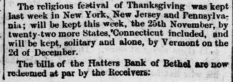 The religious festival of Thanksgiving was kept last week in New York, New Jersey and Pennsylvania; will be kept this week, the 25th November, by twenty-two more States, "Connecticut included, and will be kept, solitary and alone, by Vermont on the 2d of December. The bills of the Hatters Bank of Bethel are now redeemed at par by the Receivers: